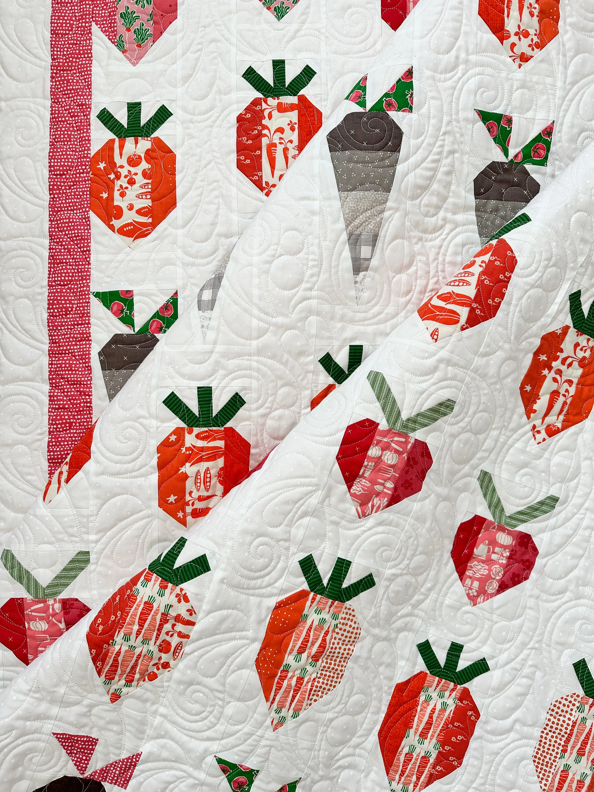 The pattern is called Veggie Garden by The Pattern Basket. Click here to get a PDF of the pattern: https://www.etsy.com/nz/listing/1198278561/veggie-garden-quilt-pattern-pdf-the