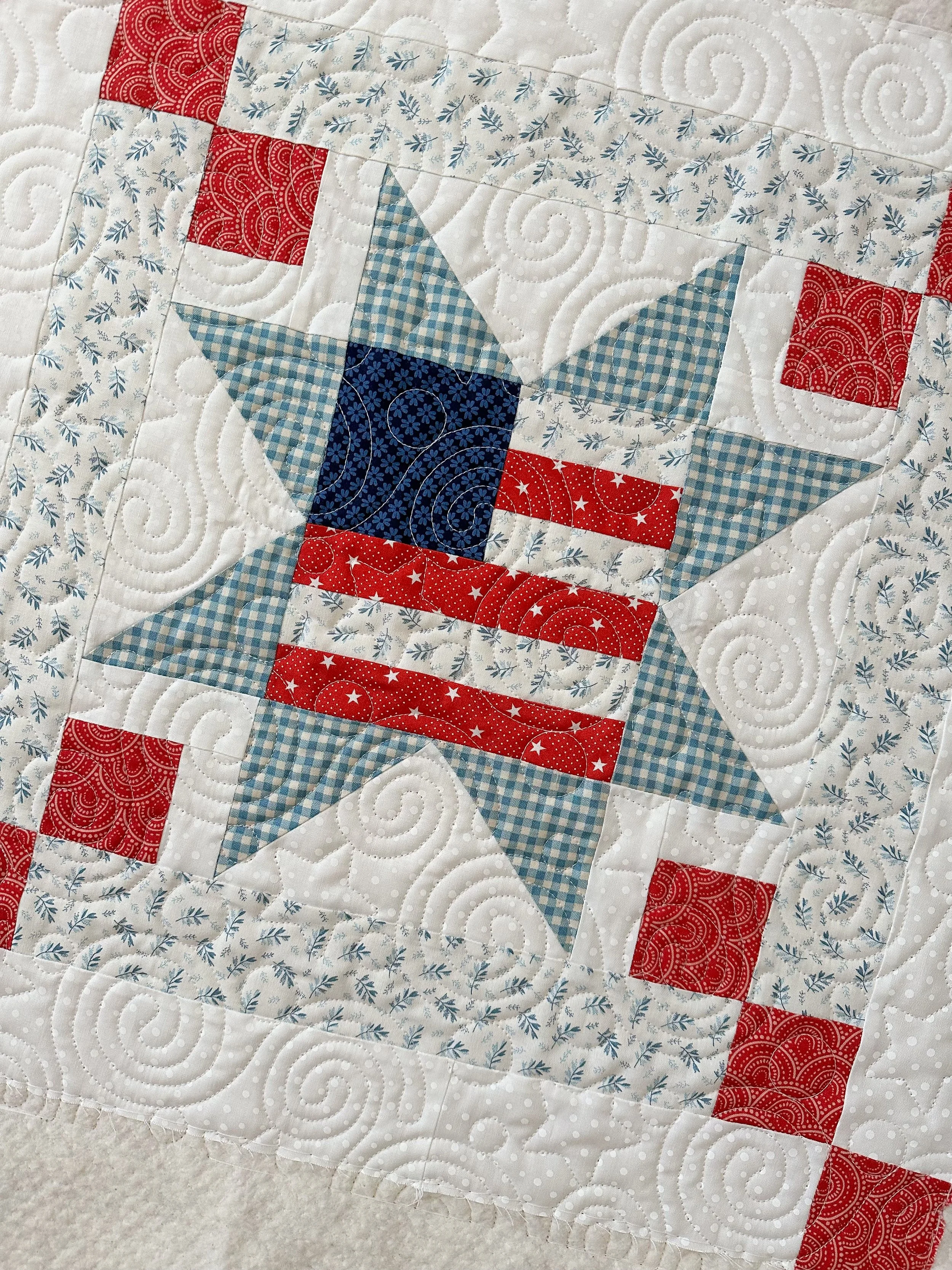 While I was sewing the quilt together, I was thinking about Mollyβs Skating panto design, which I thought would look darling on this quilt and add a little extra sparkle because of the 4 pointed star. It quilted out beautifully!! You can find it here: https://lovely-threads-quilts.myshopify.com/collections/geometric/products/skating I quilted it at a 2.5β height. I also shared a reel of me quilting out this panto on this quilt, check it out here: https://www.instagram.com/reel/DHcHrxrRwdg/?igsh=bGcxbHJ0OGNrdHR3