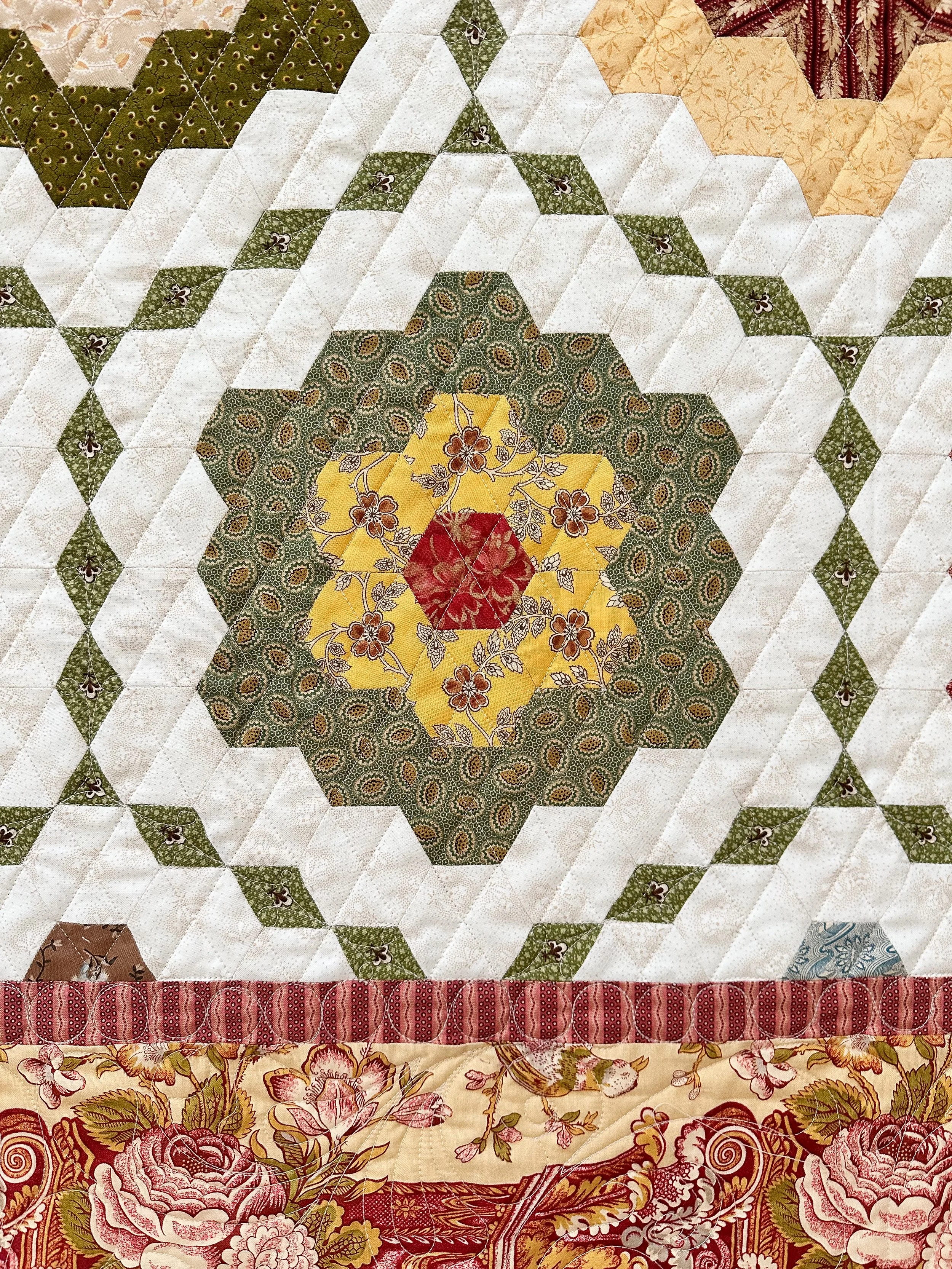 I quilted a vertical x in each of the hexies and a double looped diamond on the diamond pieces with an arc in the mini triangles. I freehand quilted pebble circles in the inner border and my Swirly Feather freehand design in the outer border. Both of which I teach in my Quilting It Freemotion video course. Check it out here: https://www.quiltingit.com/quilting-it-freemotion-course