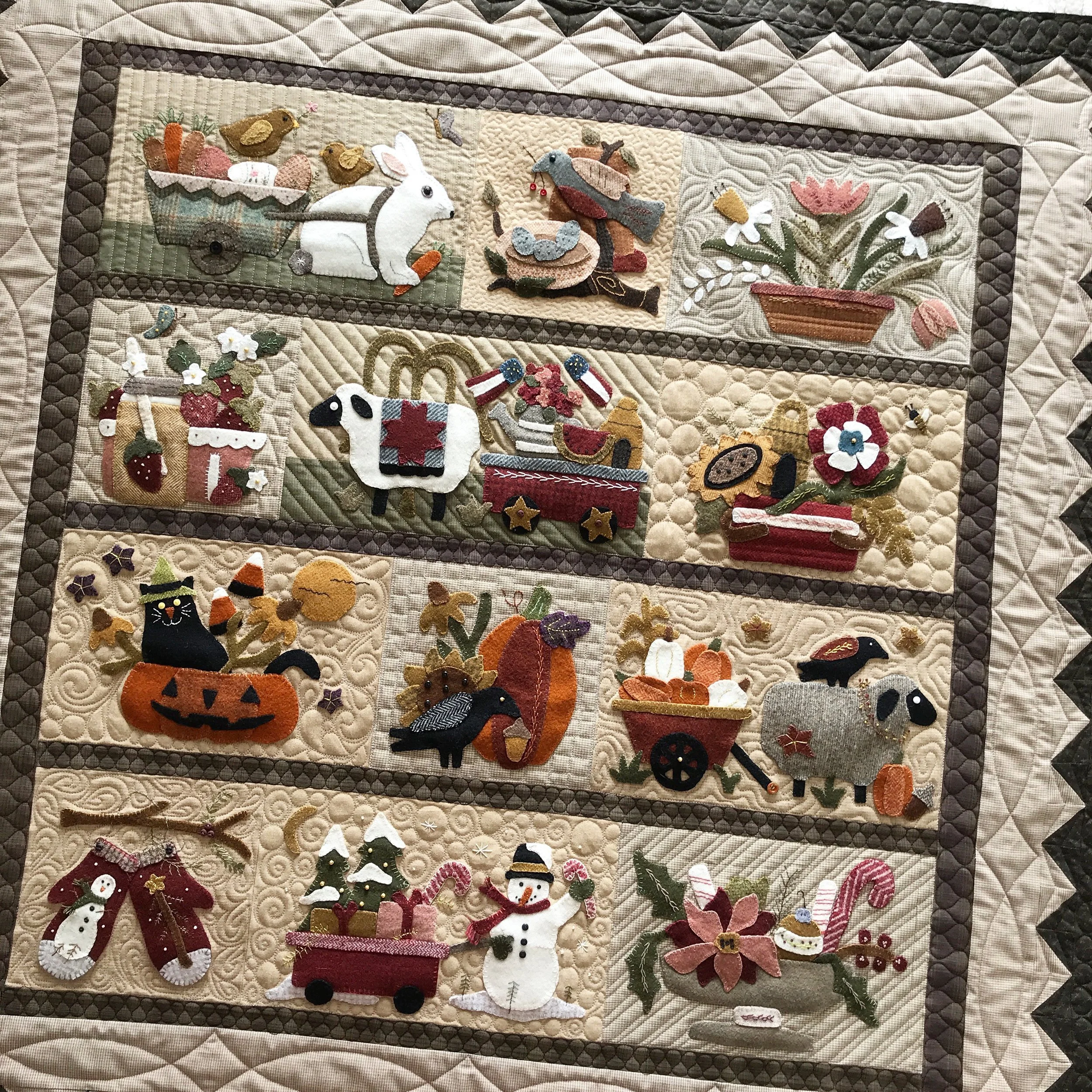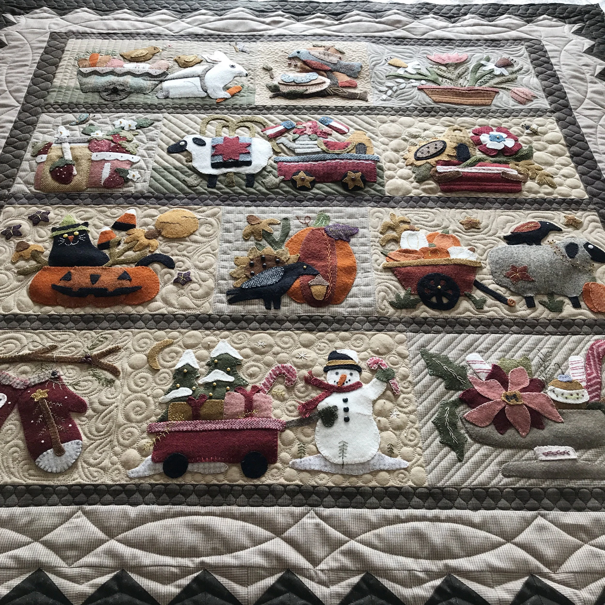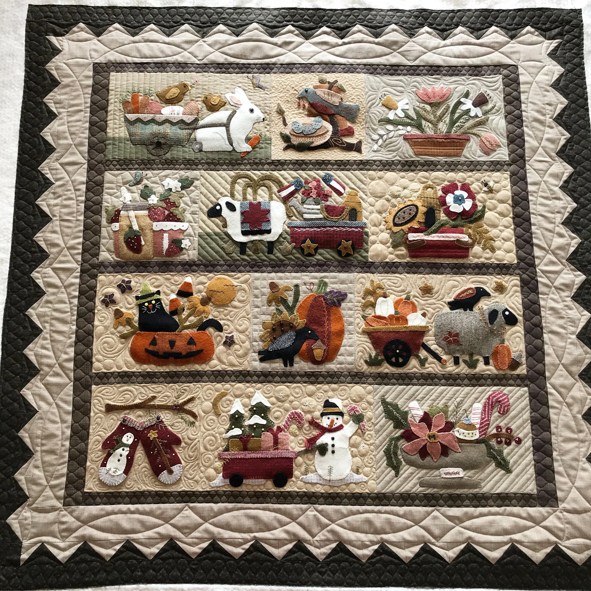 Barbara made this beautiful wool seasonal wall hanging quilt. Her handwork is amazing!! The pattern is by Buttermilk Basin, called Live Each Season. I used a dark brown 30 Tex thread for two of the borders and a taupe tan color for all the backgrounds in each block. I use a lovely 8020 cotton/poly batting, that I get from LuAnn at Wineline textiles, out of Ogden Utah. The quilting on this quilt was all about the backgrounds. I always want to do something that enhances the quilt, and with appliqué...especially wool appliqué, I love to add texture. I quilted something different in each background. I’m thinking of doing a post showing all the different design options I use for background quilting...it definitely would be a great resource for me, when I’m trying to figure out what to quilt.