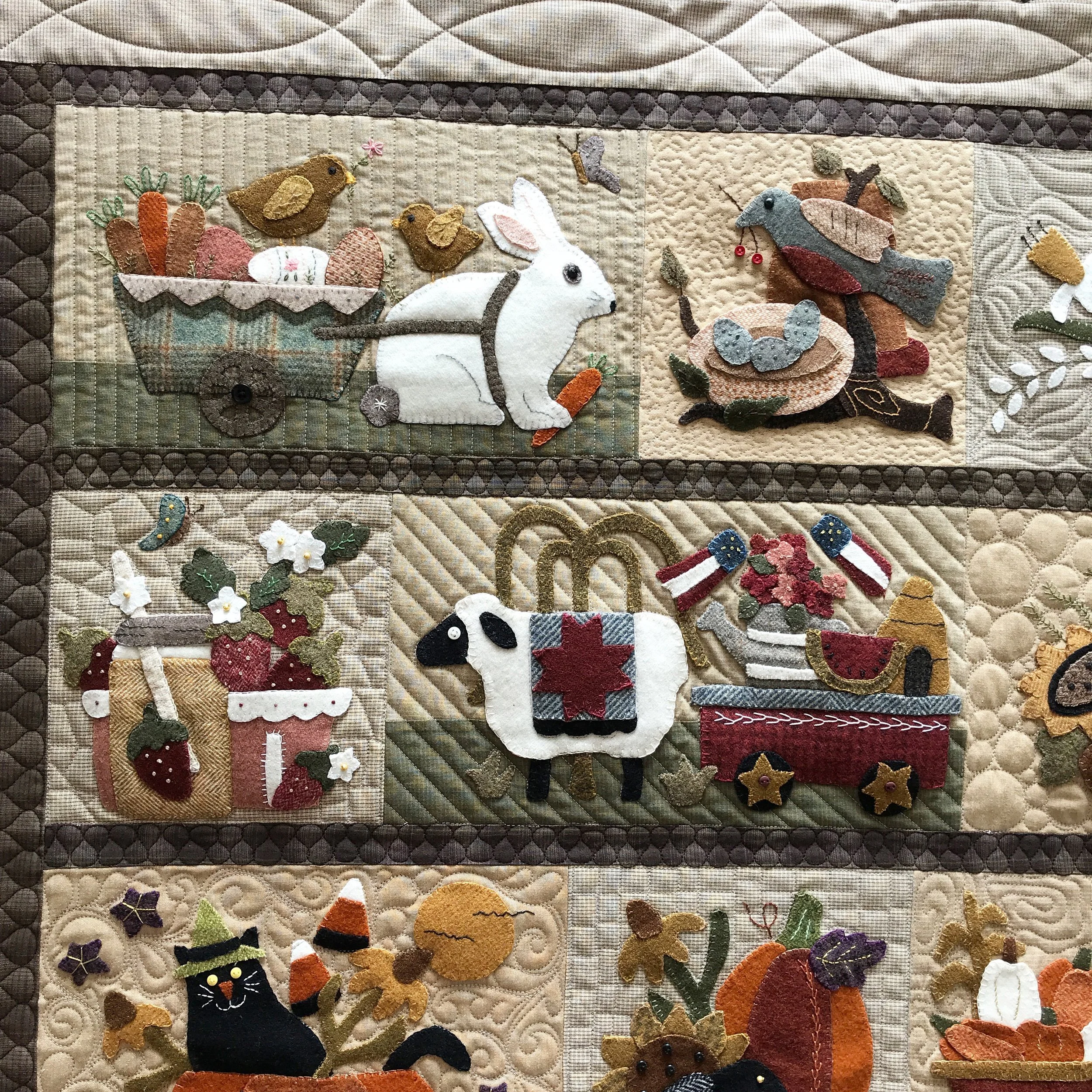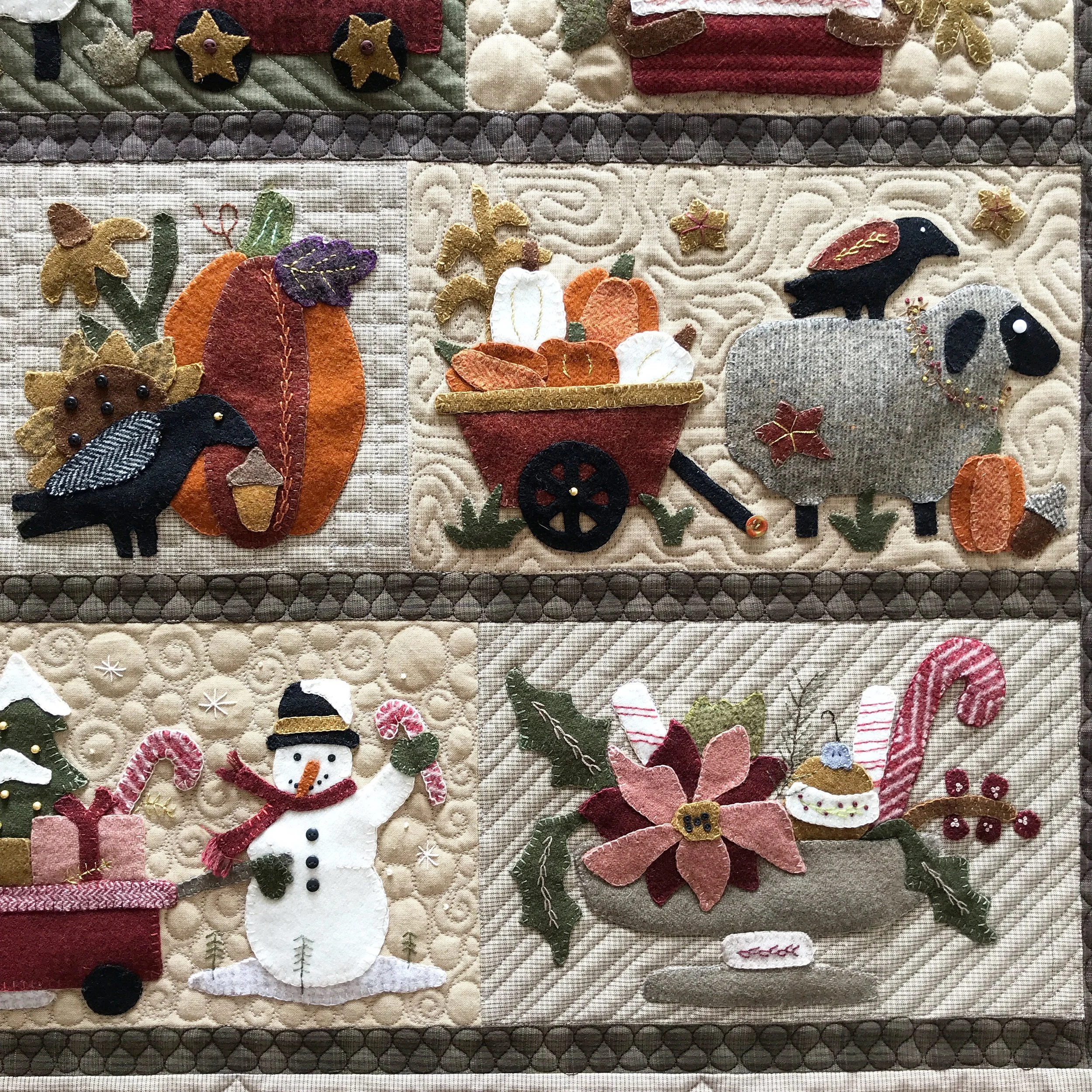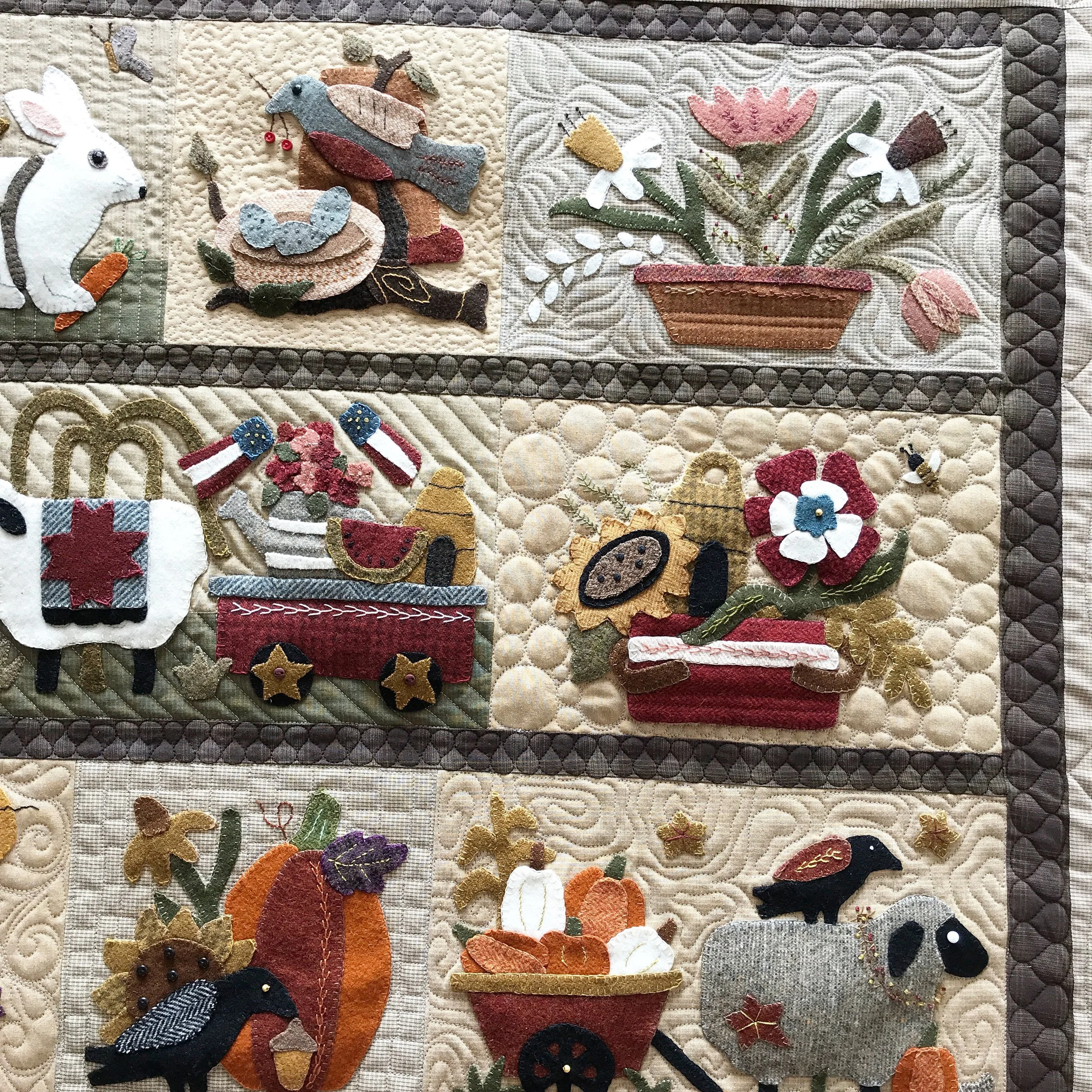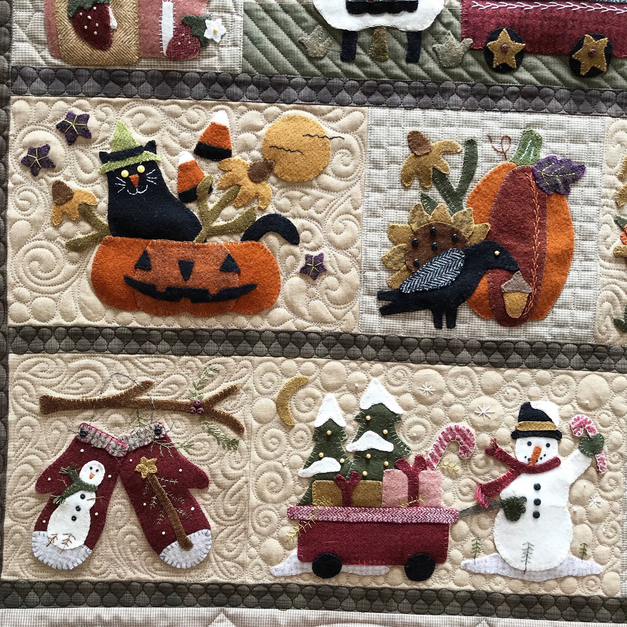 Barbara made this beautiful wool seasonal wall hanging quilt. Her handwork is amazing!! The pattern is by Buttermilk Basin, called Live Each Season. I used a dark brown 30 Tex thread for two of the borders and a taupe tan color for all the backgrounds in each block. I use a lovely 8020 cotton/poly batting, that I get from LuAnn at Wineline textiles, out of Ogden Utah. The quilting on this quilt was all about the backgrounds. I always want to do something that enhances the quilt, and with appliqué...especially wool appliqué, I love to add texture. I quilted something different in each background. I’m thinking of doing a post showing all the different design options I use for background quilting...it definitely would be a great resource for me, when I’m trying to figure out what to quilt.