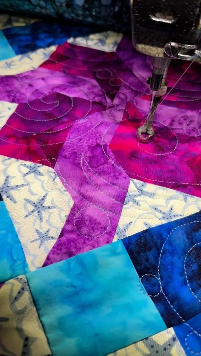 My goal with the quilting on quilts like this, is to create lots of different textures that compliment one another. Curves, pebbles, lines, ribbon candy, leaves with swirls, and grassy texture. Love it all together!!