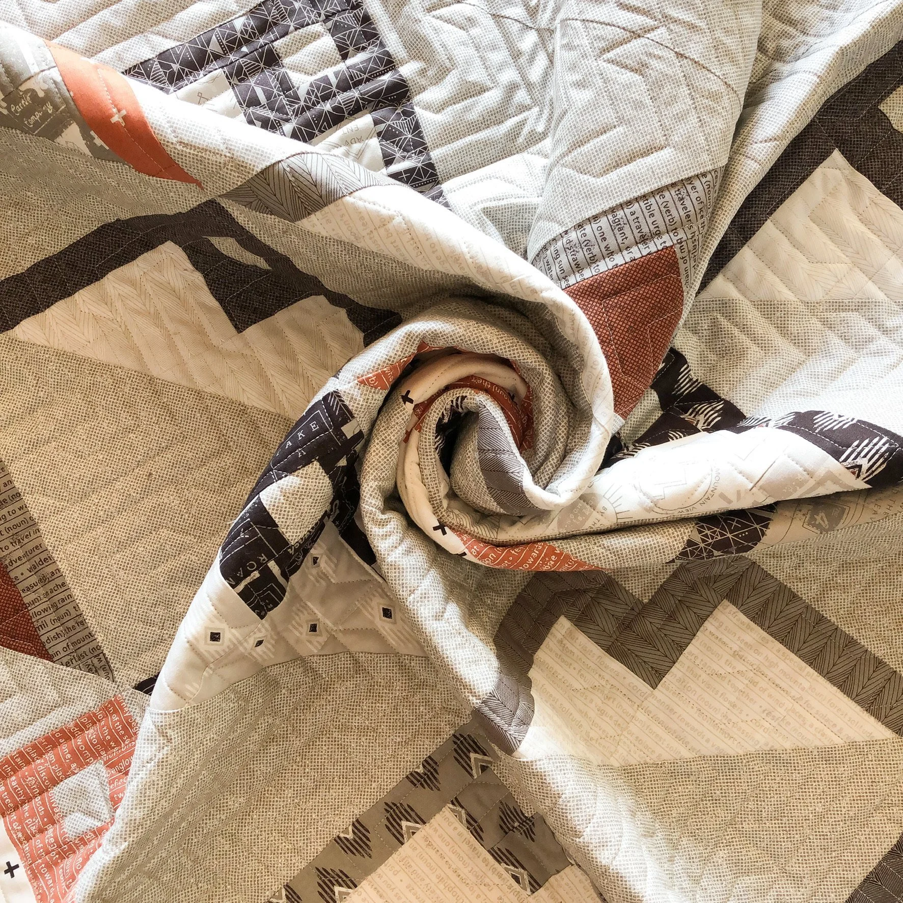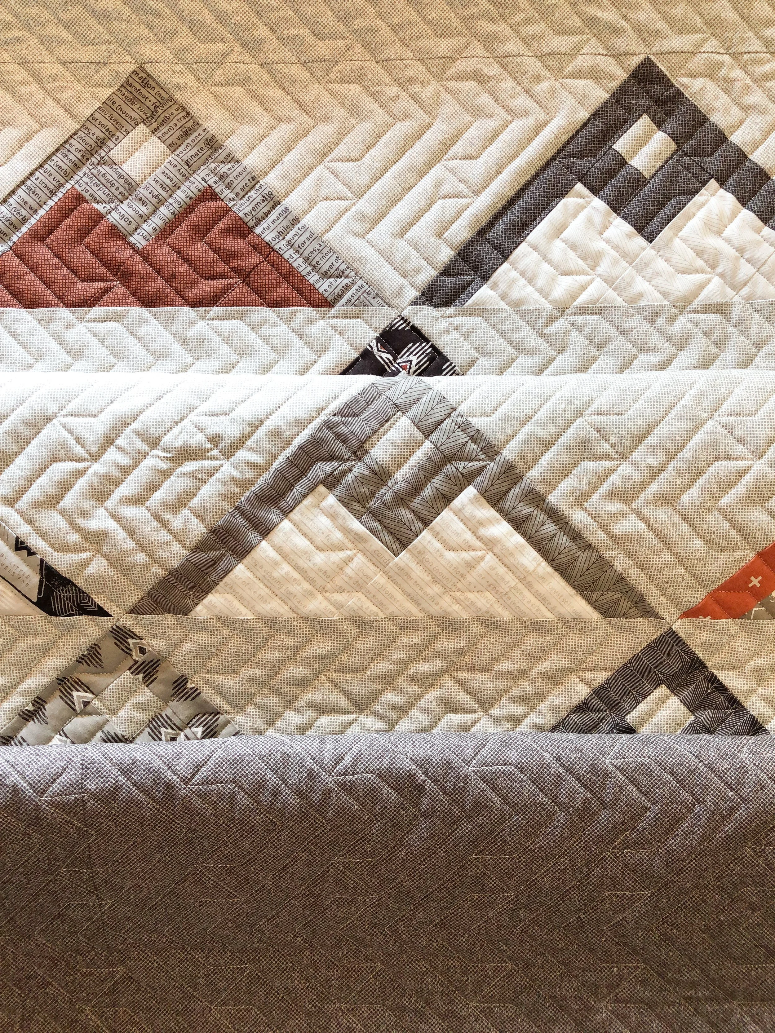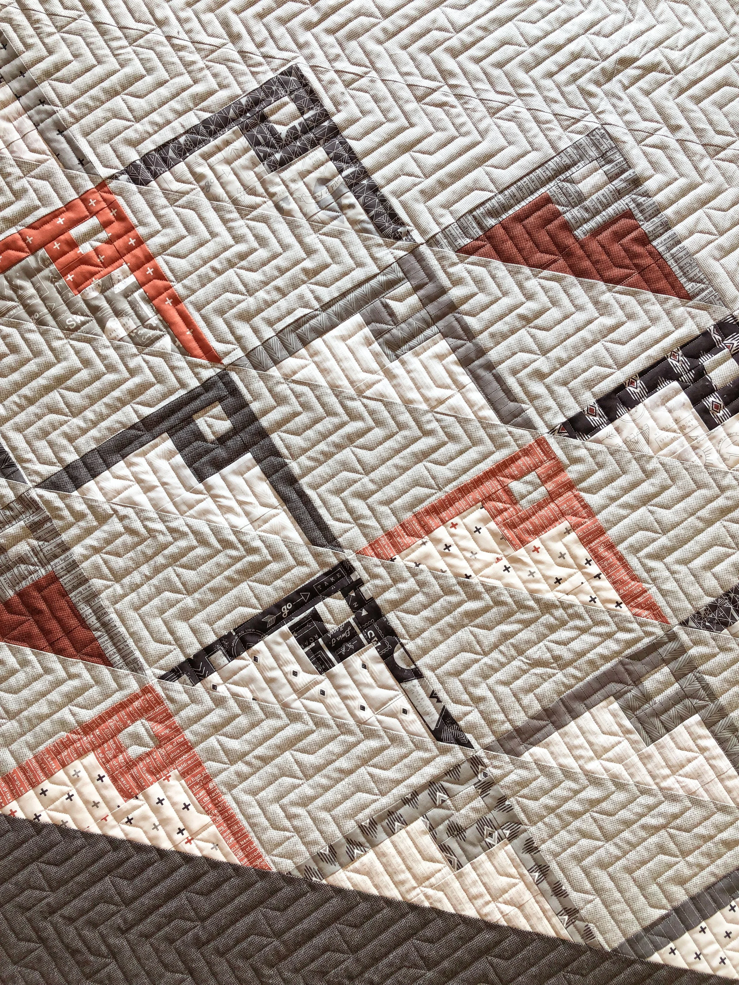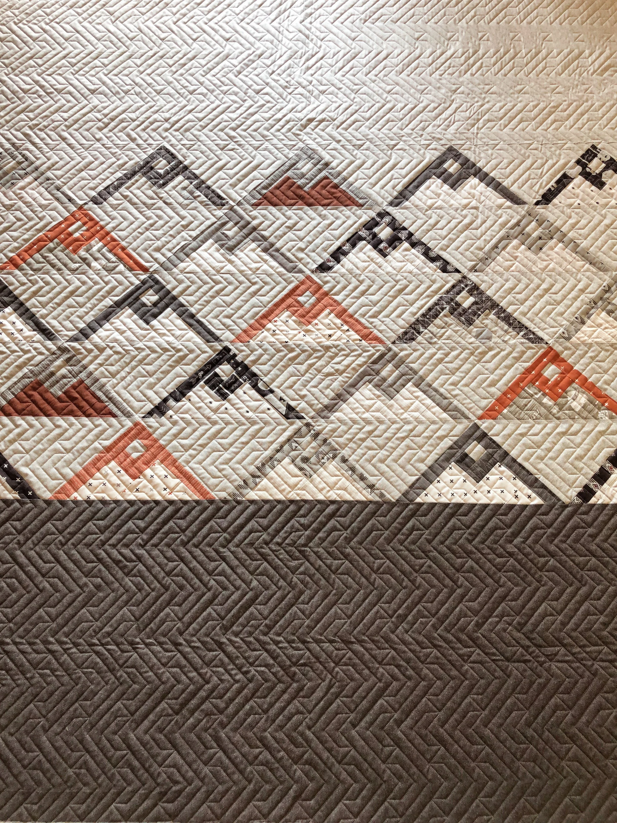 The pattern is called Mountainside by Vanessa from Lella Boutique, and it’s made with her Smoke and Rust line of fabric. This is such a cool quilt. The combination of fabrics… colors, prints and the pattern…such an awesome option if you’re looking for a guys quilt.