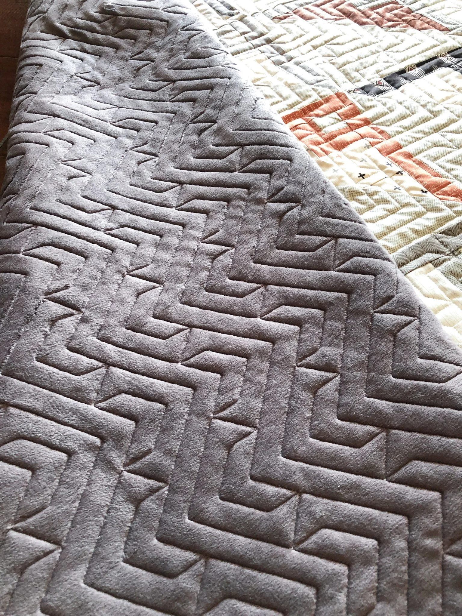 And…look at that cool texture on the minky backing!! I love the solid 90” wide minky from Shannon Fabrics, it shows the quilting beautifully. I personally think the embossed or textured minkys compete with the quilting. Let the quilting create the fabulous texture, and you’ll love it every single time. At least I do.