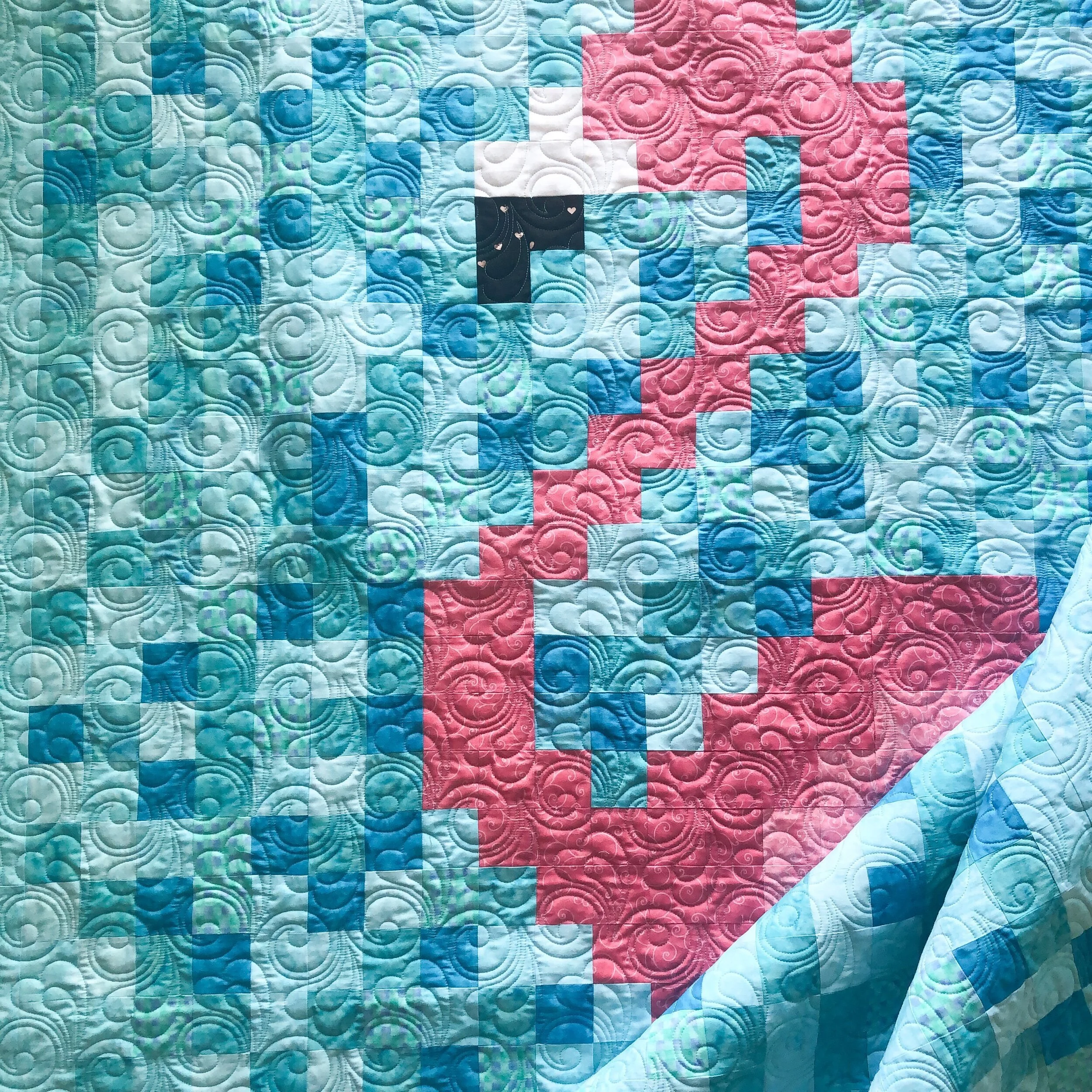 We decided on Cupid, one of Patricia Ritter and my quilting designs for the quilting. It’s available at Urban Elementz. I think it turned out cute!! I love how the swirls and heart like feather soften the overall look of the quilt.