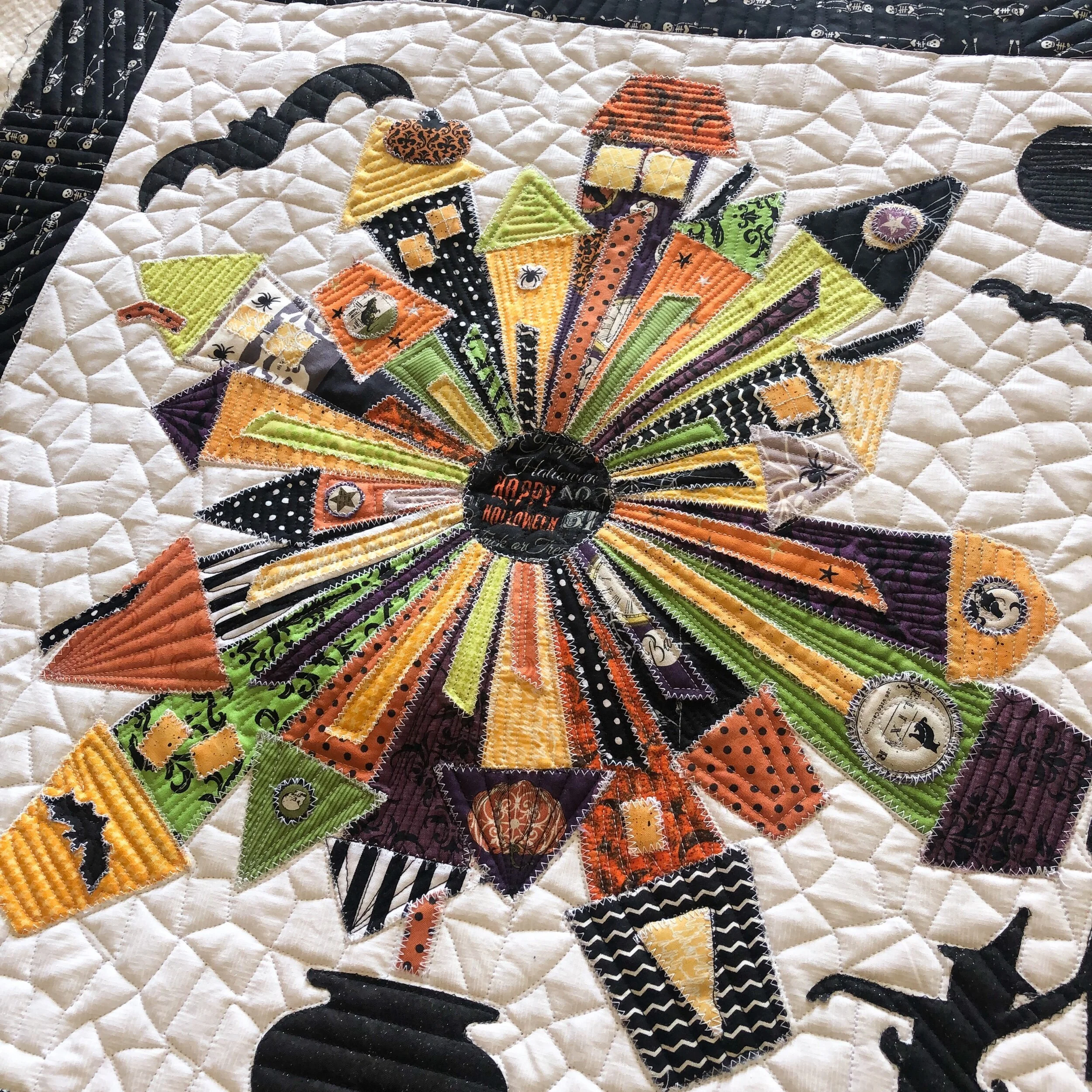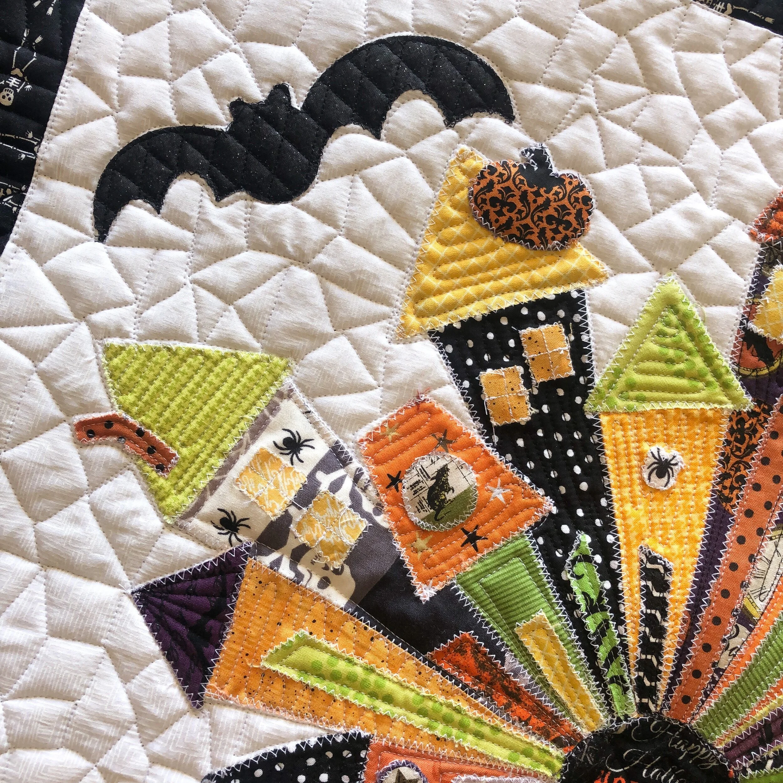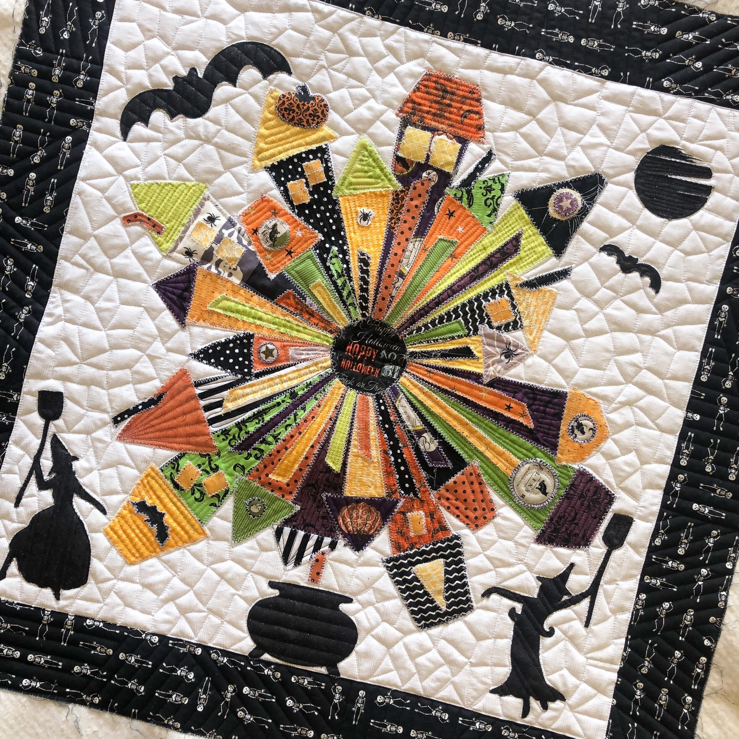 Hope all is well for each one of you!! Are you looking for a fun Halloween wall hanging? My dear friend Ramona made this fun “Dresden Neighborhood Haunted Houses” wall hanging. Pattern is by Persimon Dreams. Ramona added a few more things, like the bats, witches, and moon…which she found on her cricket, I believe. I think they are such a cute addition to the quilt. Ramona is so creative, and it’s fun to see her create things, as she is sewing.