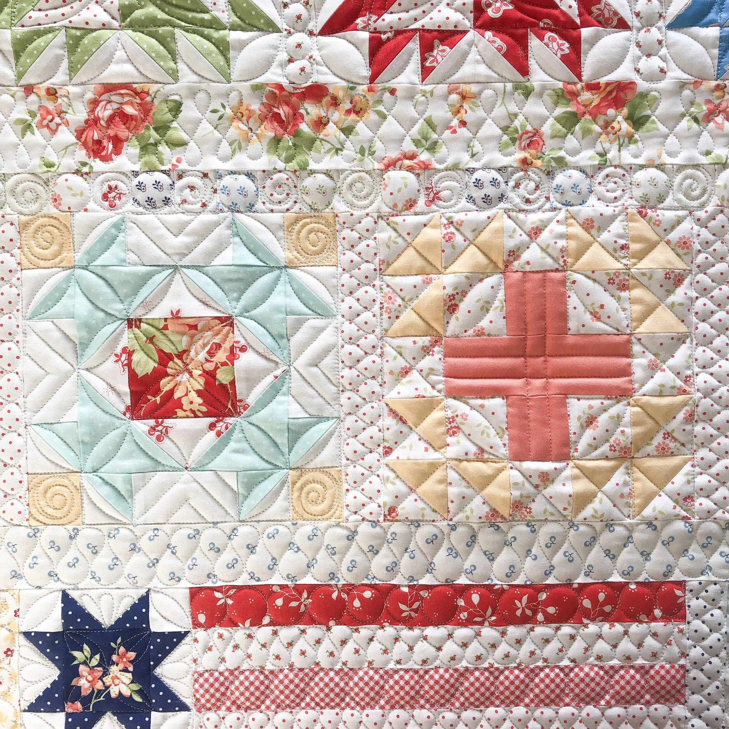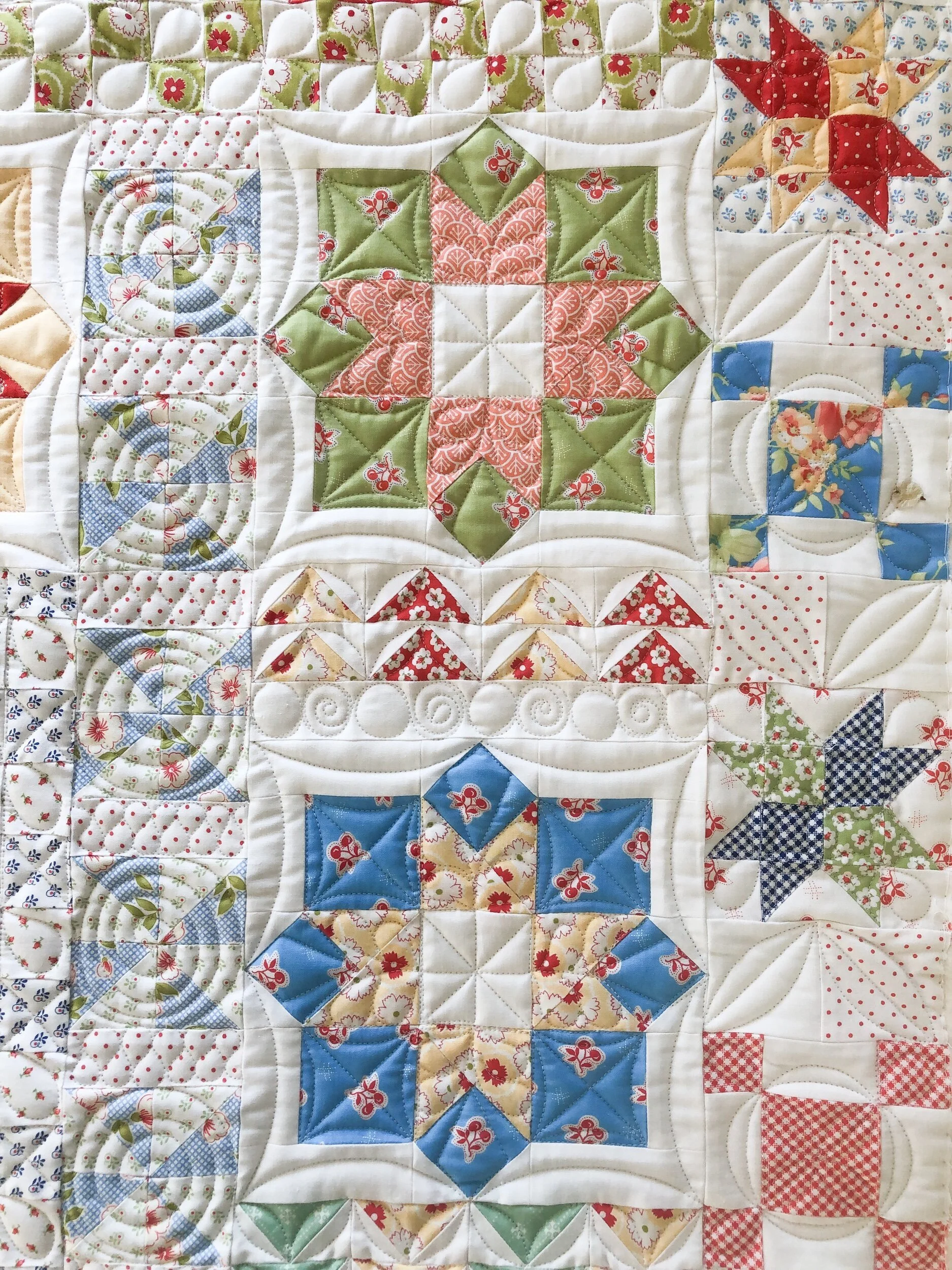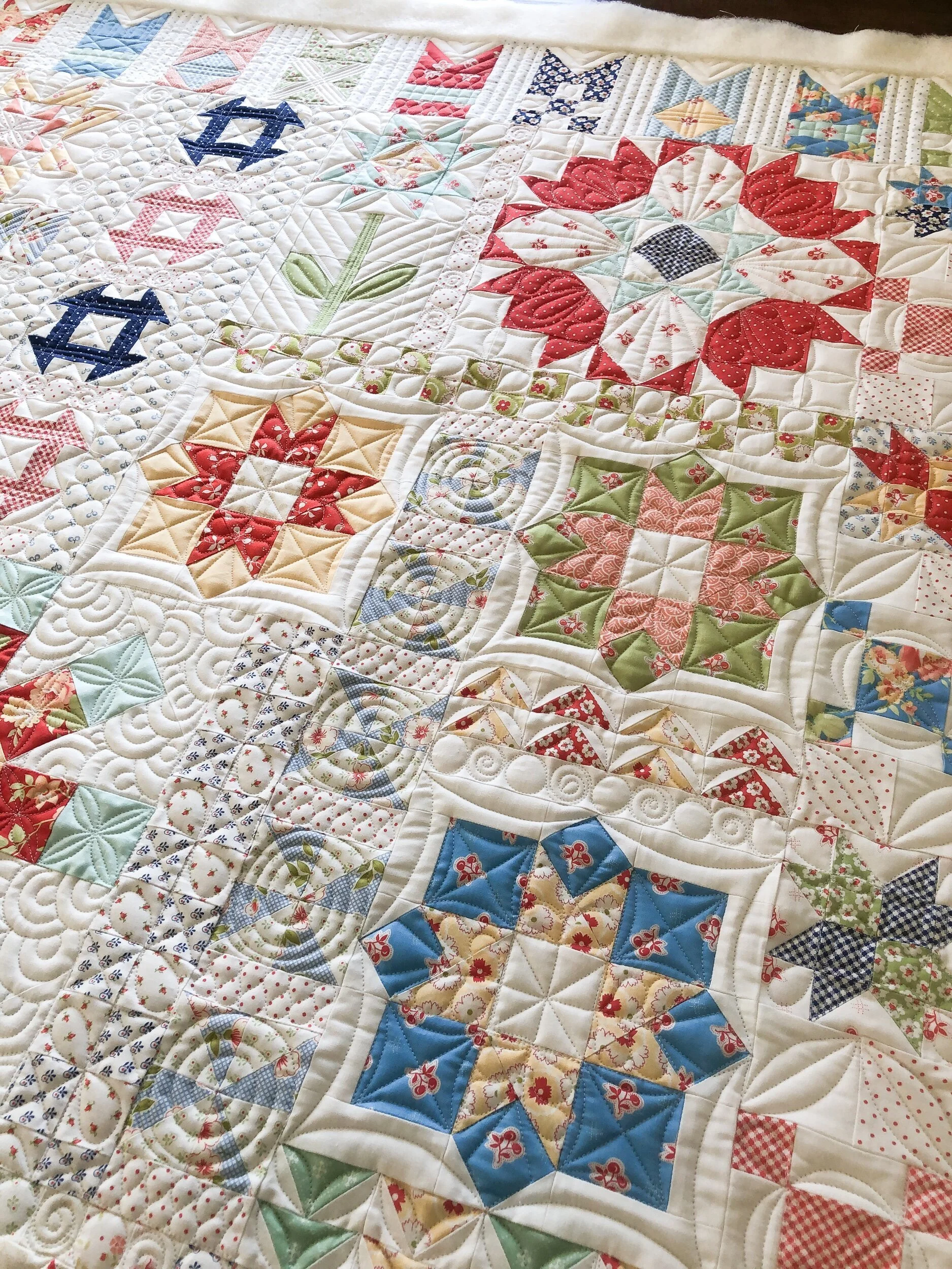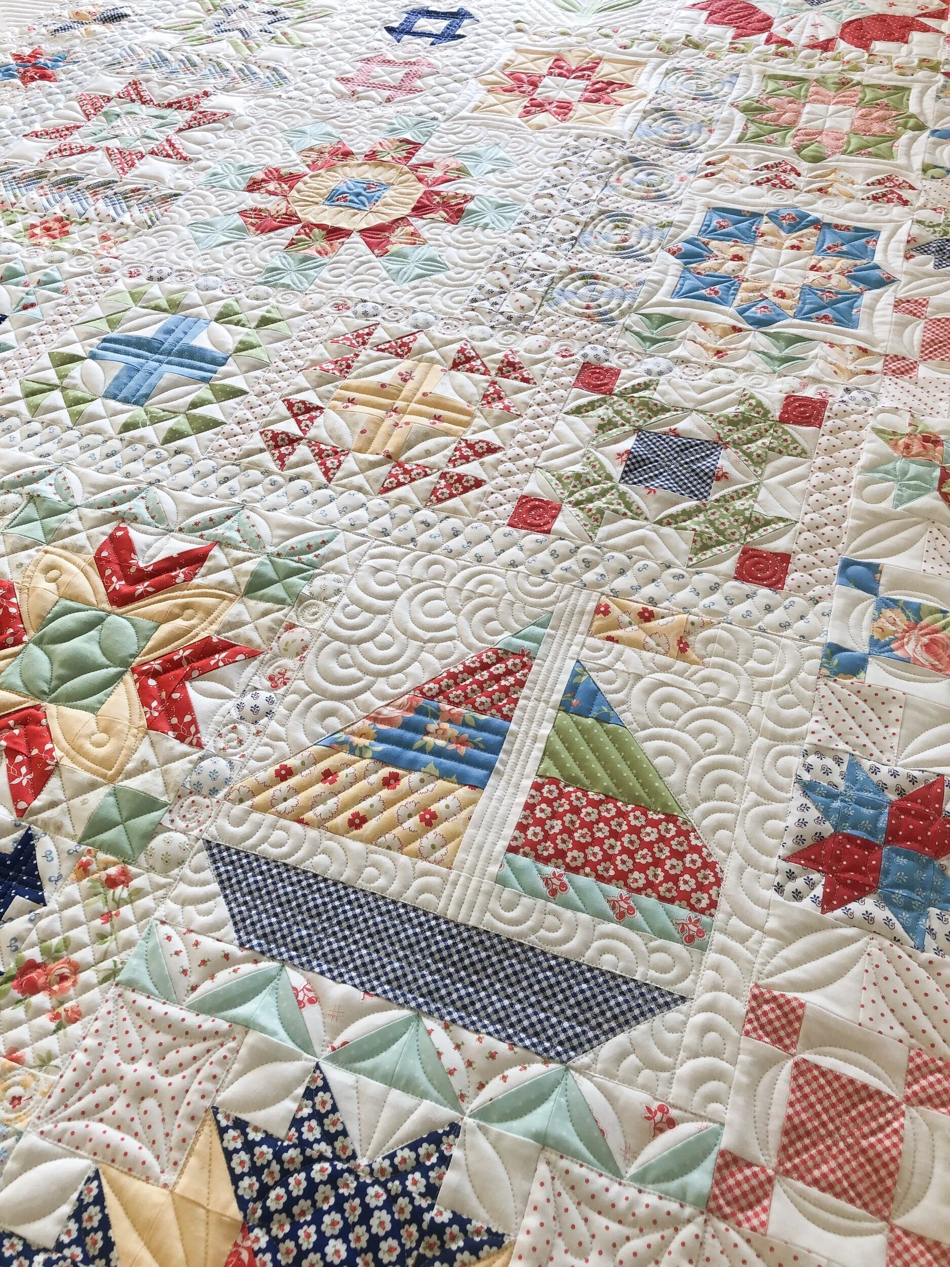 Orange peel petals in a variety of sizes, circles and swirls, ribbon candy, arcs, a variety of different lines, and so on. If you look at the quilt, that’s really all it is. The variety of those designs really play well with the shapes in the quilt blocks, and adds such an incredible amount of texture. This is my favorite way to quilt a sampler quilt. I also want to point out there isn’t a lot of background filler…stippling, pebbles or swirls, grassy texture…and so on. The only background filler is my overlapping circles in three of the blocks. A couple of wagon wheel blocks and the sail boat block. By simplifying the backgrounds, the quilt blocks shine and the quilt isn’t over quilted. I like to use the “background” of a quilt block to enhance the quilting within the block. It adds so much to the block itself, making it unique because of the shapes, yet keeping that design harmony. My quilting philosophy is to keep my quilting clean. It just looks so much better! If you machine quilt, I challenge you to try something custom on the next sampler that you quilt. Don’t be afraid of rulers, if you haven’t tried them. They are an incredible asset to your quilting, and can help you achieve some pretty amazing designs!!