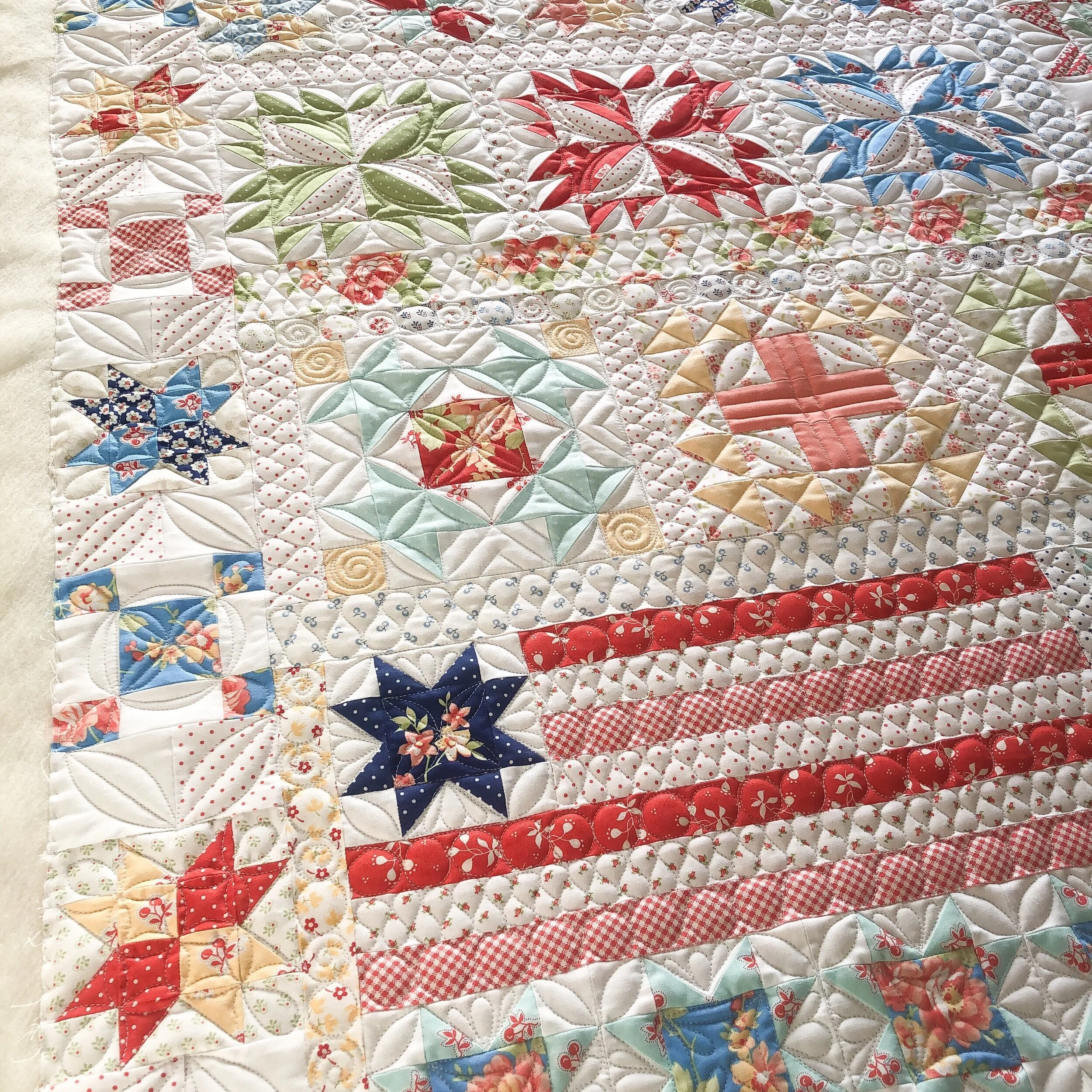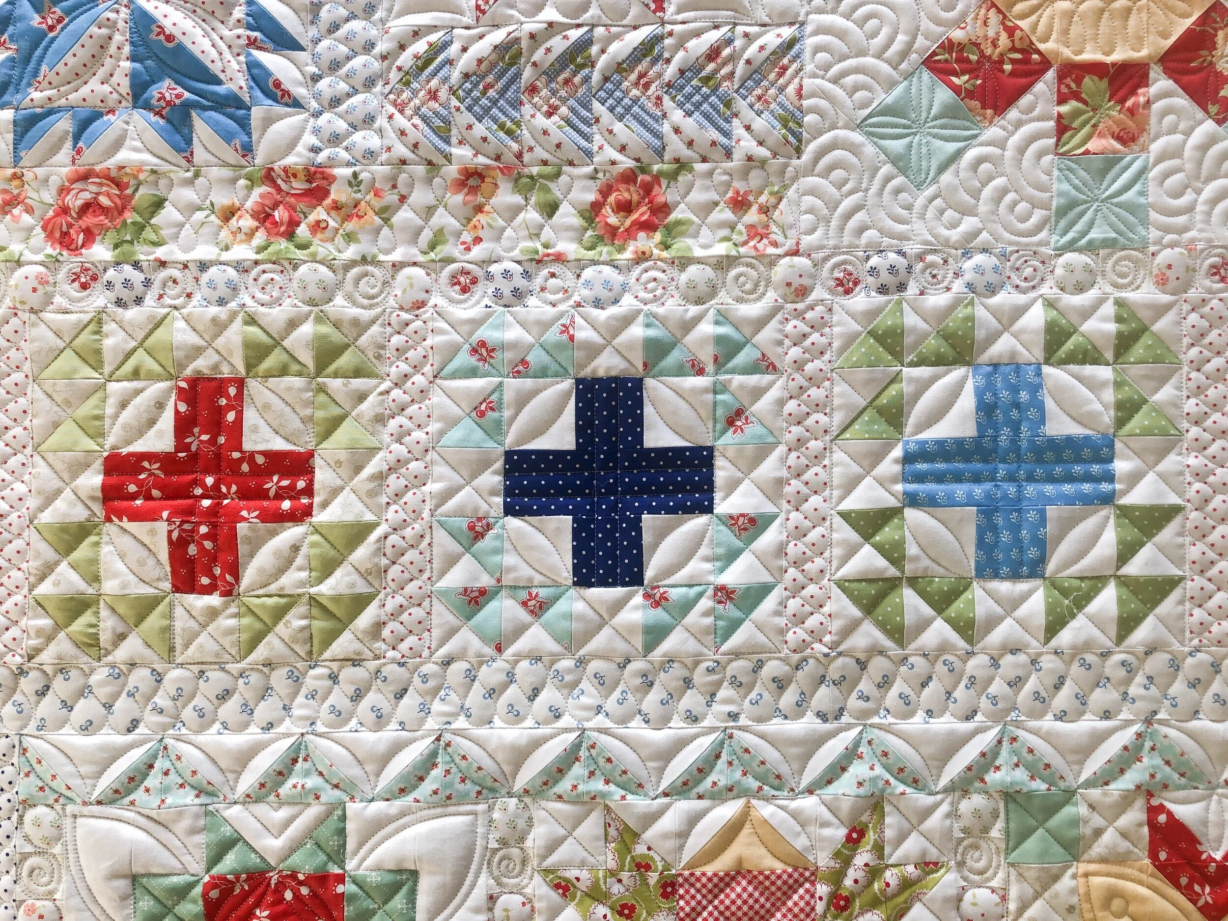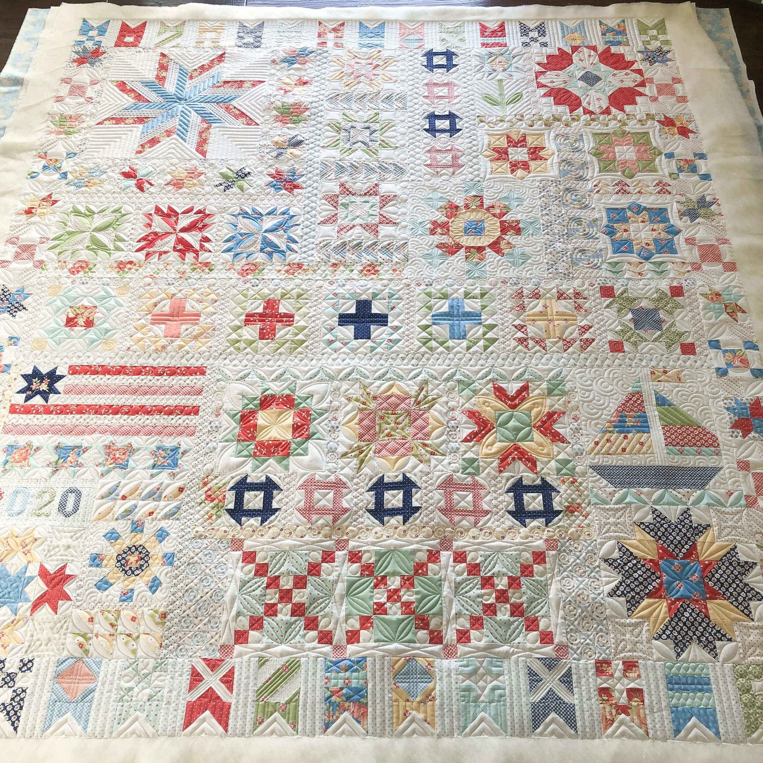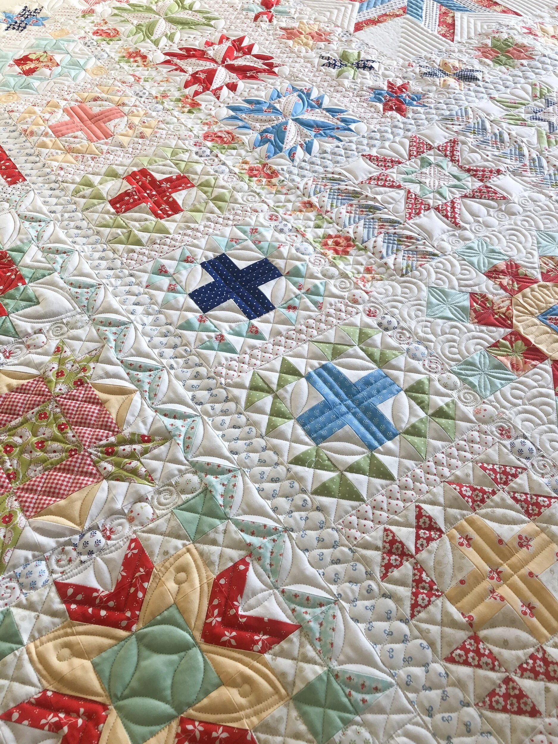Orange peel petals in a variety of sizes, circles and swirls, ribbon candy, arcs, a variety of different lines, and so on. If you look at the quilt, that’s really all it is. The variety of those designs really play well with the shapes in the quilt blocks, and adds such an incredible amount of texture. This is my favorite way to quilt a sampler quilt. I also want to point out there isn’t a lot of background filler…stippling, pebbles or swirls, grassy texture…and so on. The only background filler is my overlapping circles in three of the blocks. A couple of wagon wheel blocks and the sail boat block. By simplifying the backgrounds, the quilt blocks shine and the quilt isn’t over quilted. I like to use the “background” of a quilt block to enhance the quilting within the block. It adds so much to the block itself, making it unique because of the shapes, yet keeping that design harmony. My quilting philosophy is to keep my quilting clean. It just looks so much better! If you machine quilt, I challenge you to try something custom on the next sampler that you quilt. Don’t be afraid of rulers, if you haven’t tried them. They are an incredible asset to your quilting, and can help you achieve some pretty amazing designs!!