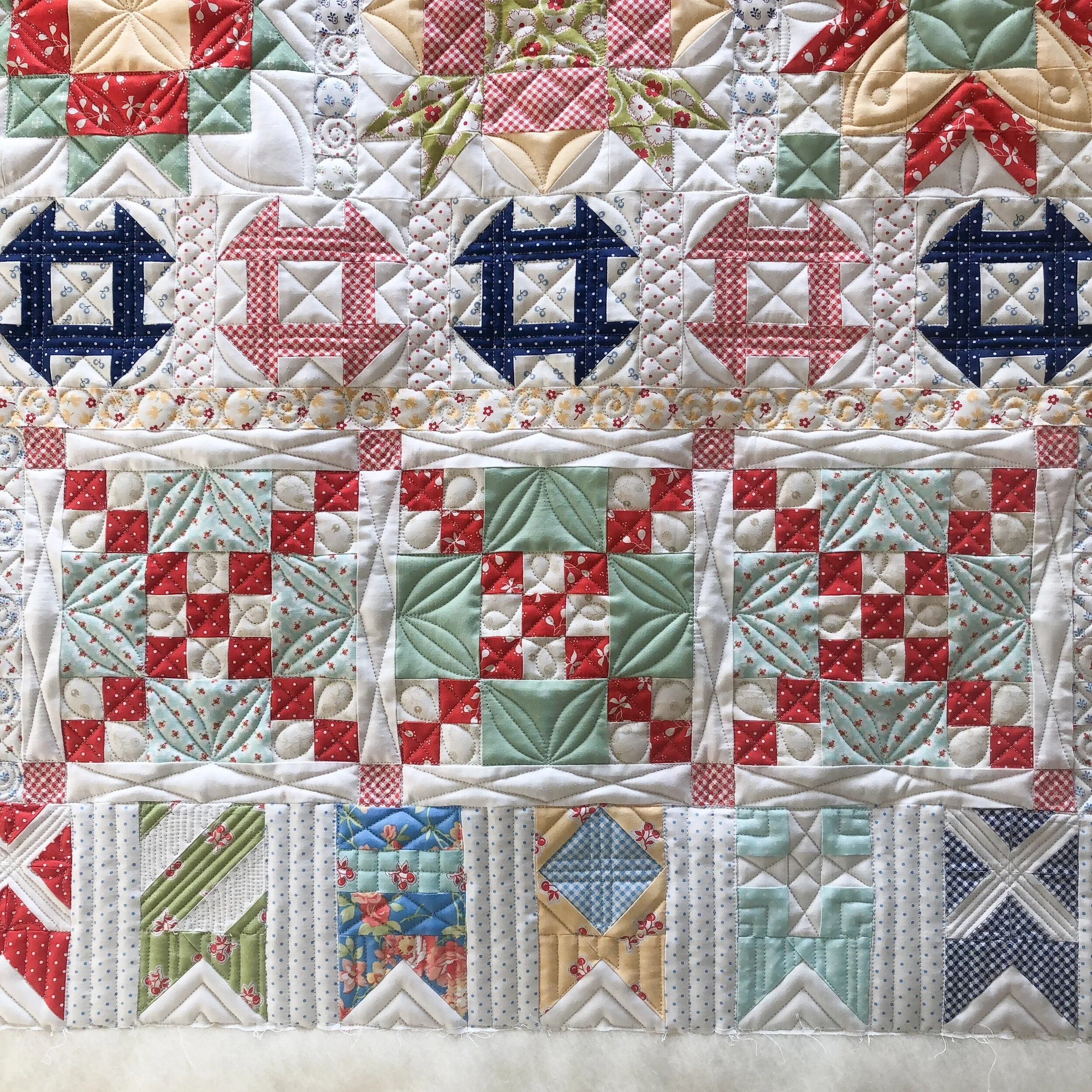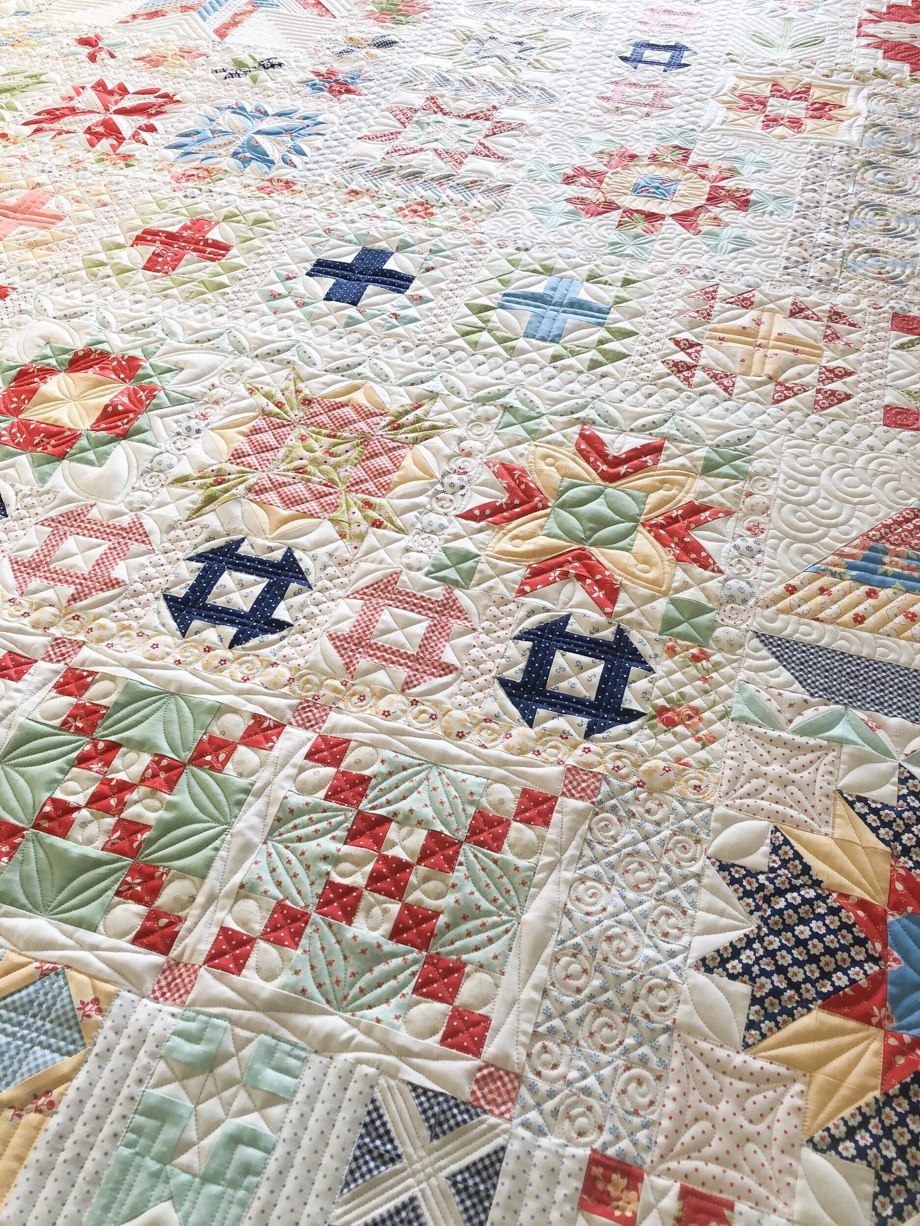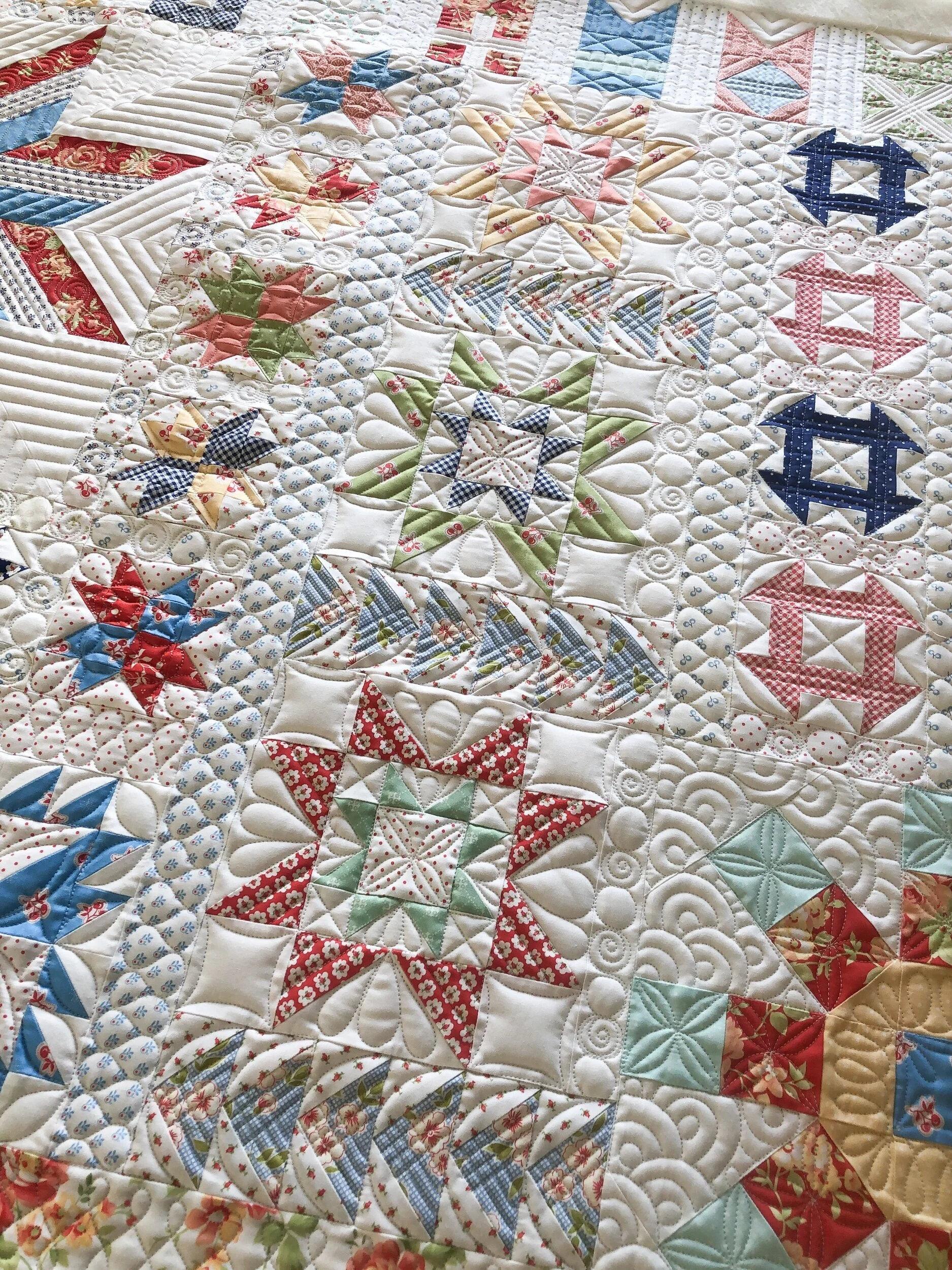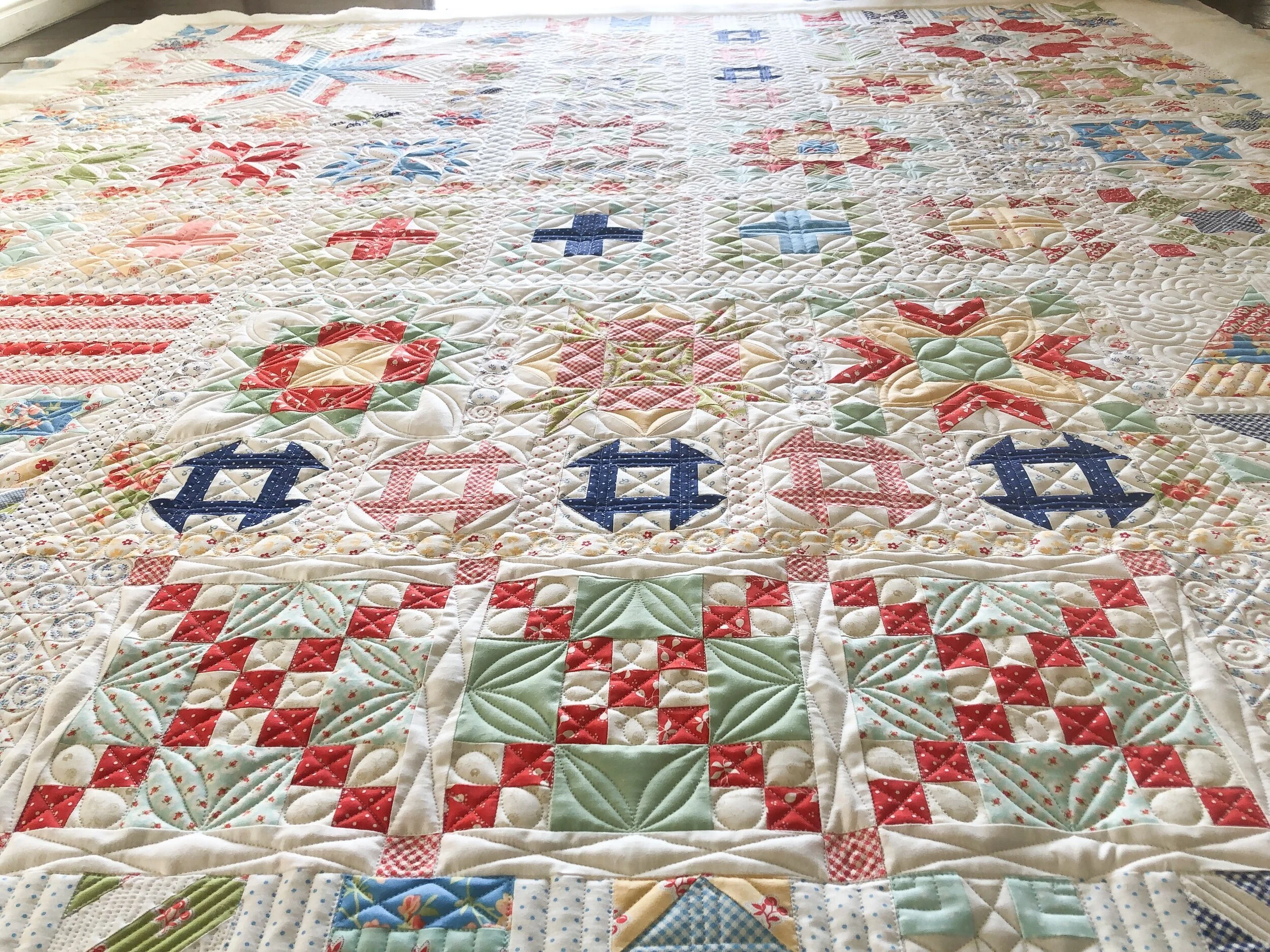 If you made it this far, thank you!!! I wanted to share lots and pictures and thoughts about this quilt. You can see why I’m behind on getting this quilt blogged, too many details to share. I also wanted the time to share my approach to quilting a sampler quilt. They may seem daunting with the variety of blocks and block sizes, however as you use similar designs throughout…you can quilt something beautiful.