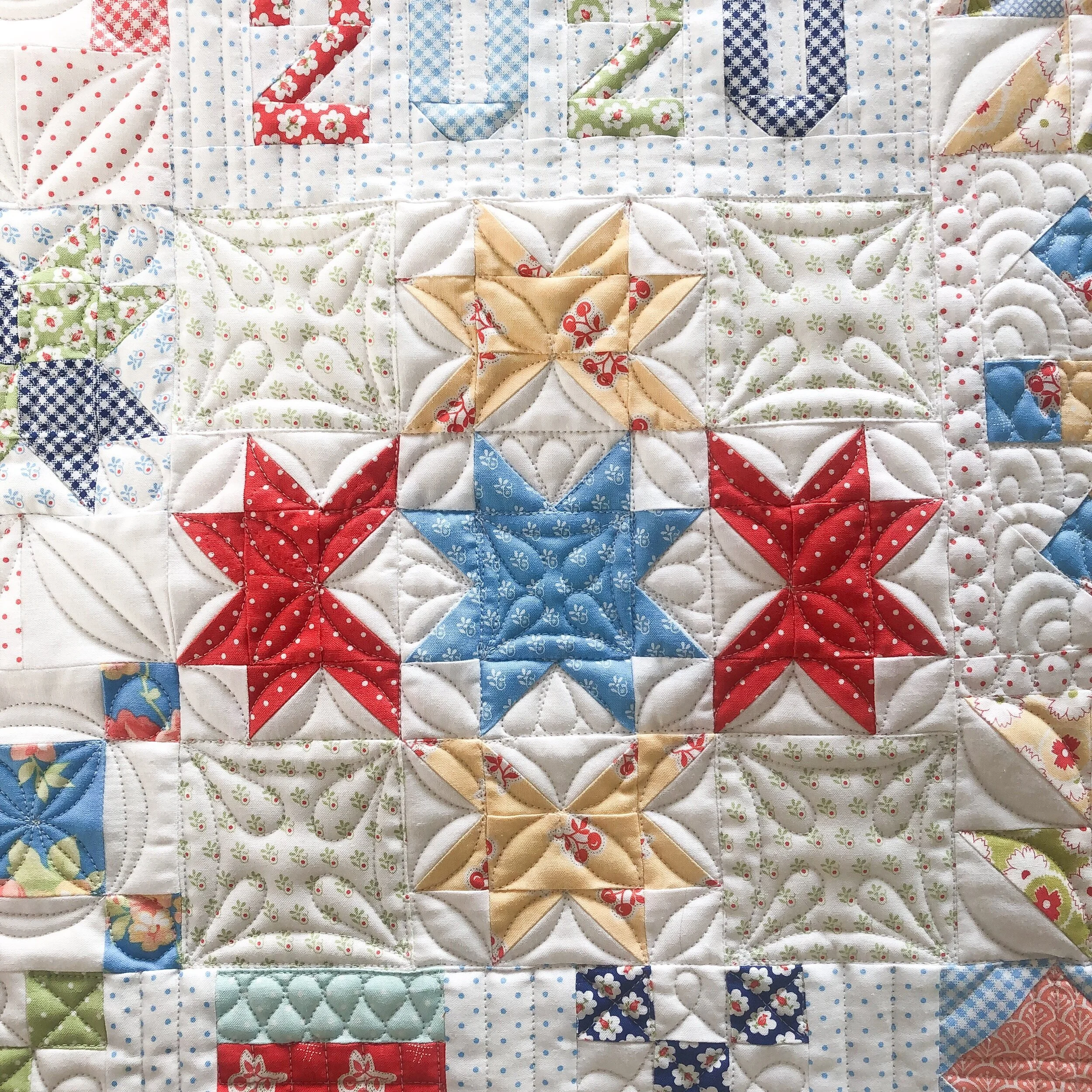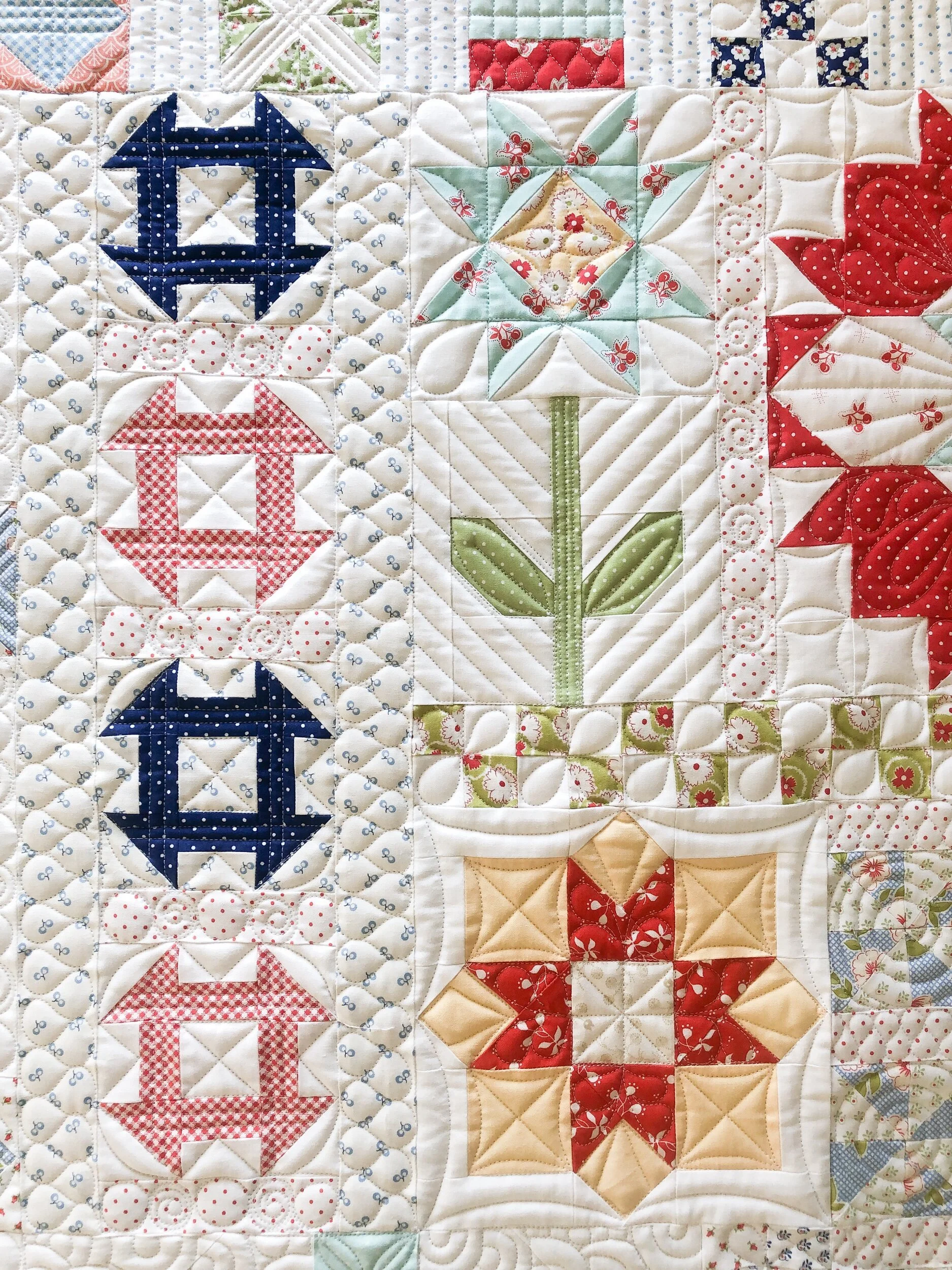 The bunting blocks are such a fun touch. They are also along the top edge as well. That light blue block with the simple x’s adds some fun depth to that block.