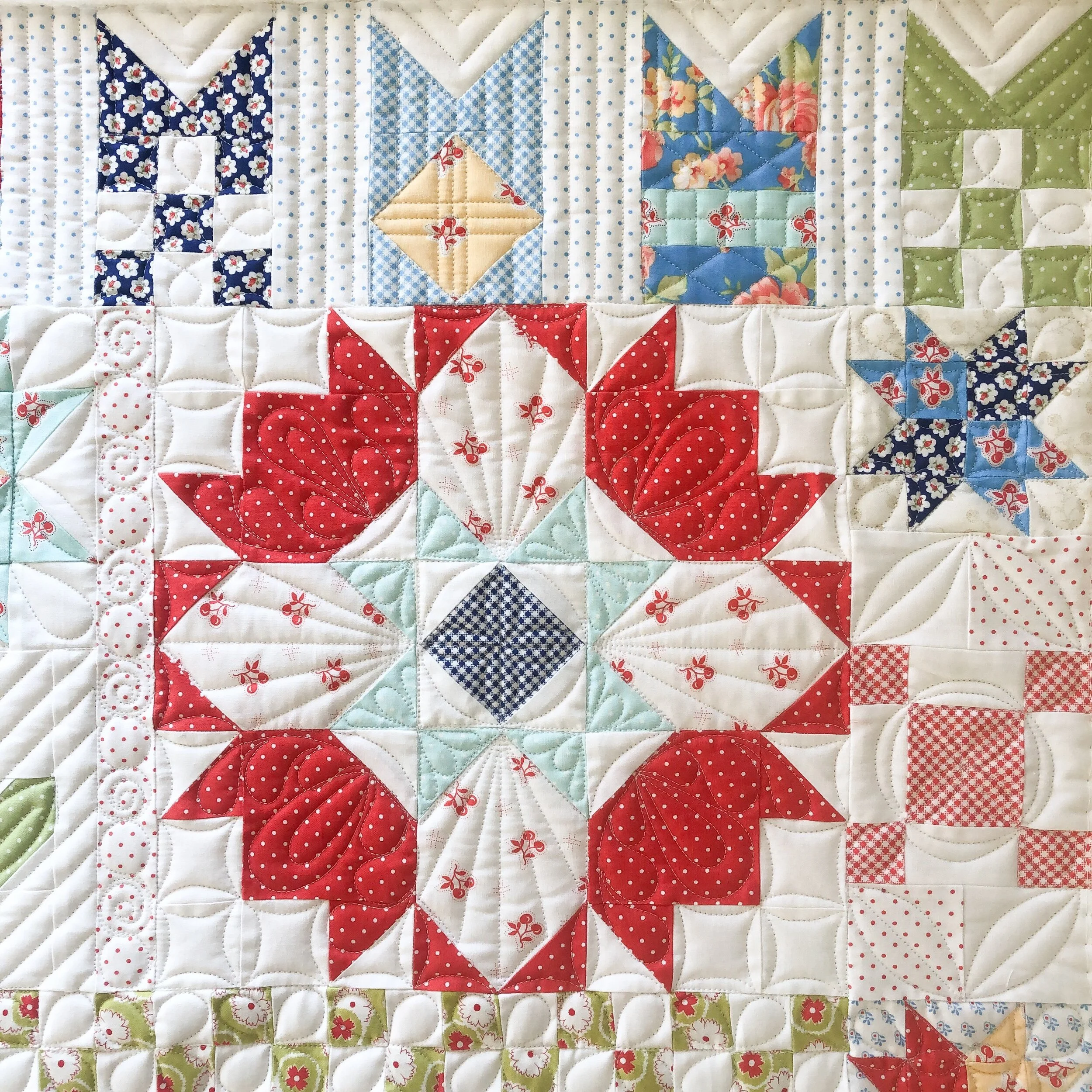 I hope all is well with you!! I was doing so good at catching up on blogging quilts, and then our summer just got busy. I’m back, and ready to share Dot’s amazing quilt with you!! I hope you enjoy all the pictures…there are a lot of them. As I share this quilt with you, I am going to talk about some of the things that I quilted, and some pointers on how to quilt such a detailed sampler quilt…lets get started!!
