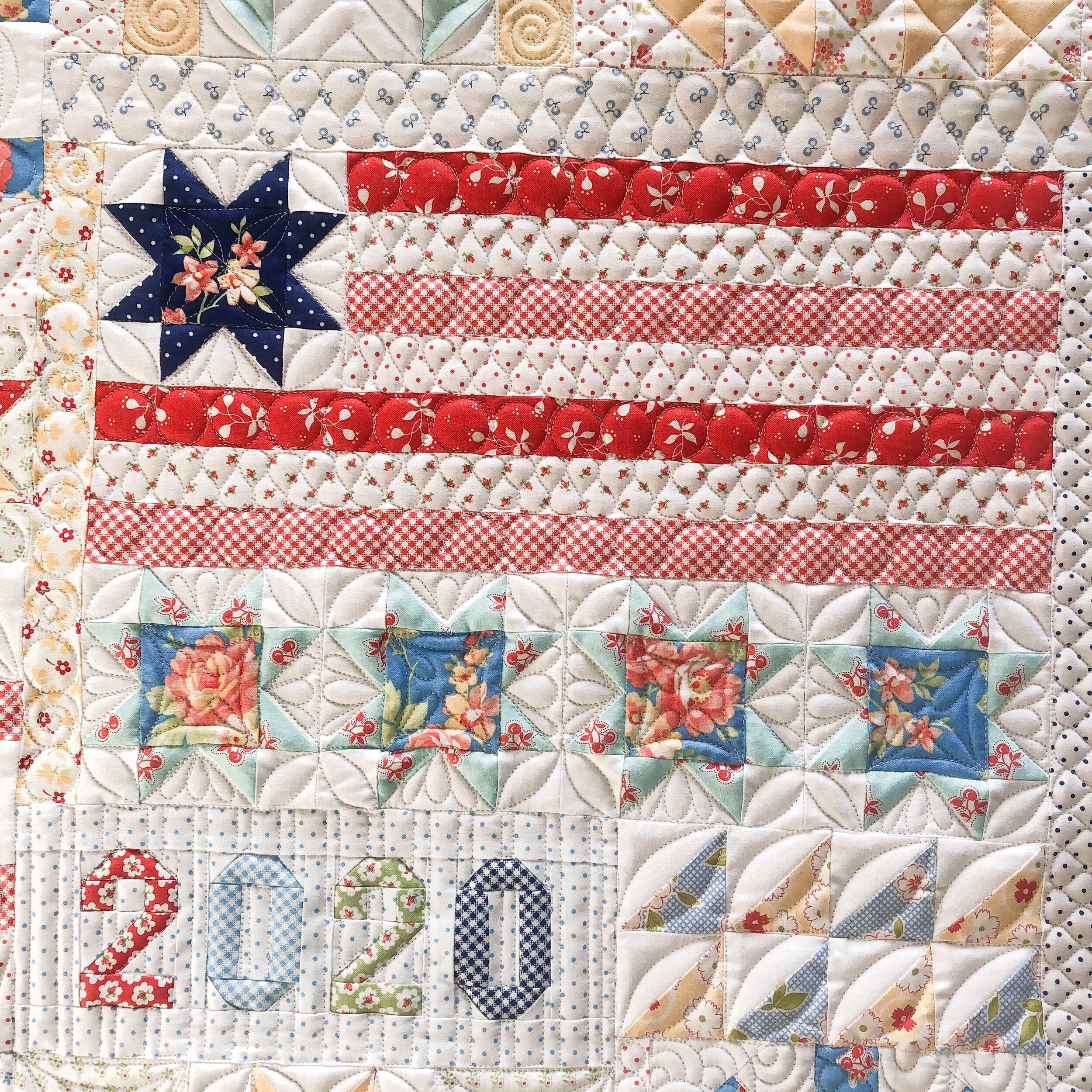 How cute is that navy block in the flag?!?!?! I quilted the blue blocks below the flag nearly identical to the navy one. The center square is just a little different. I also love the simple pinstripe behind the 2020.
