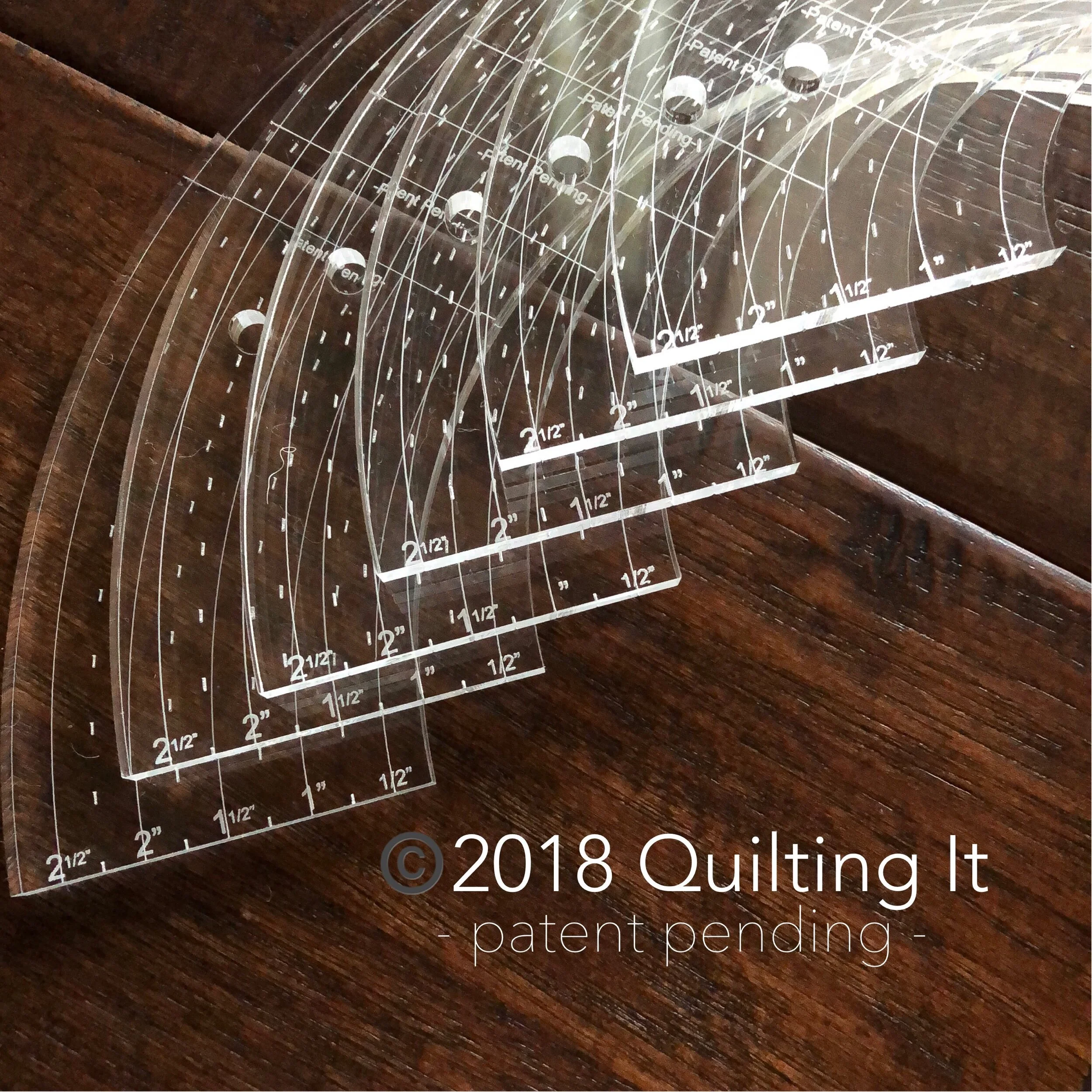 Below you can see an angled look at the clear set stacked up, and see the measurements along the straight edge. Notice the 1/4” lines from the inside of the ruler to the outside, which help tremendously with quilting. If needed reference the picture above to see the lines as well. So, the question I get asked a lot, clear vs. green, which is better and why so you offer both. The clear are cheaper to make, and some quilters are used to working with clear rulers. The green ones are actually not much more in price, but add a great depth especially when placed on lighter fabrics. It’s easier to see the lines better, which some quilters prefer. Truly it is a matter of preference.