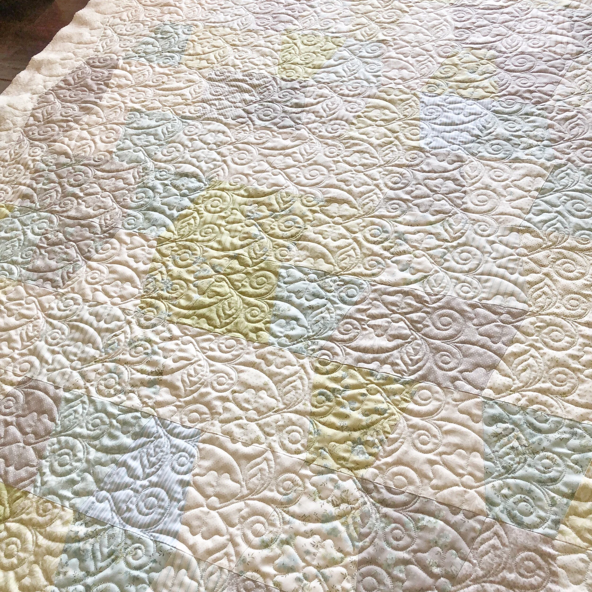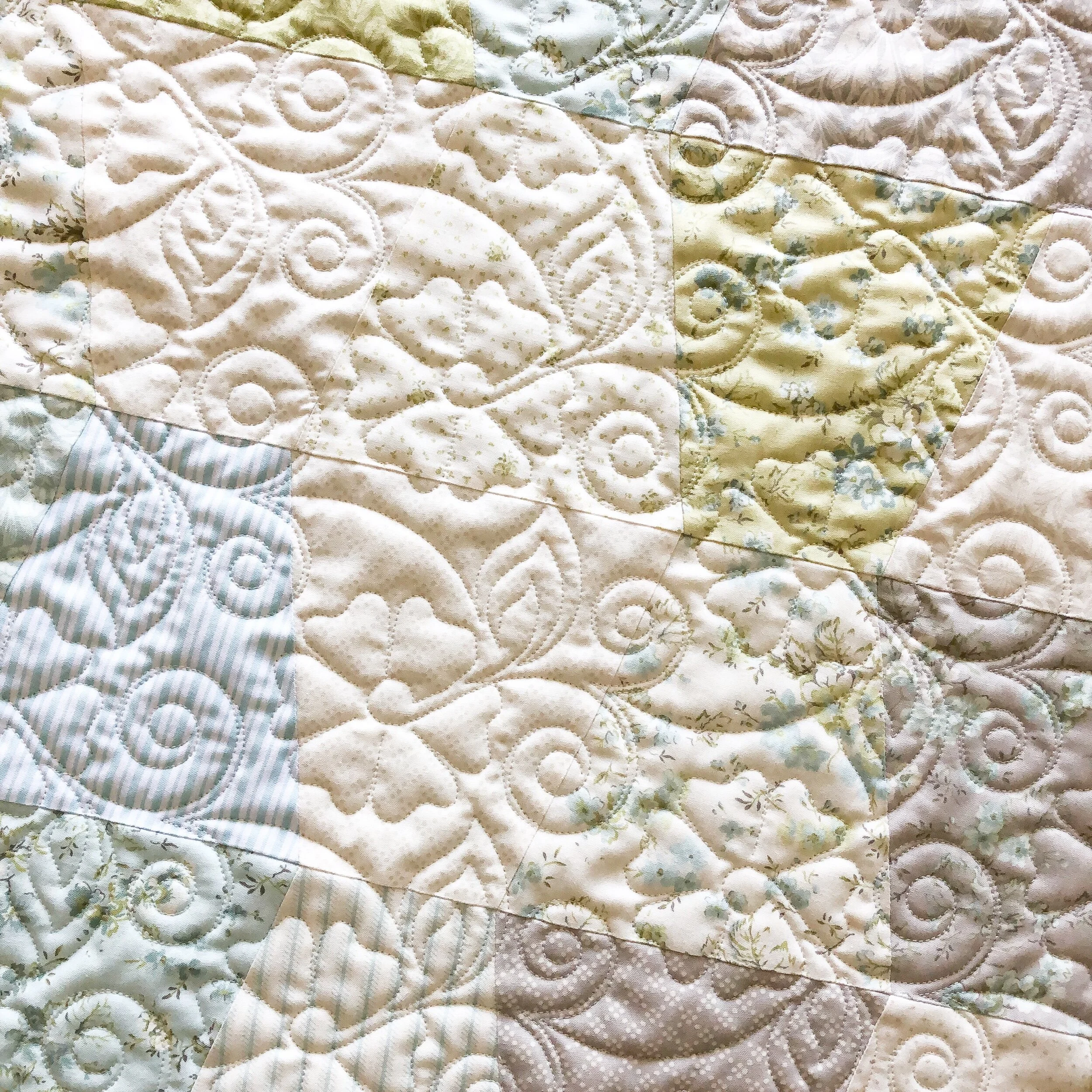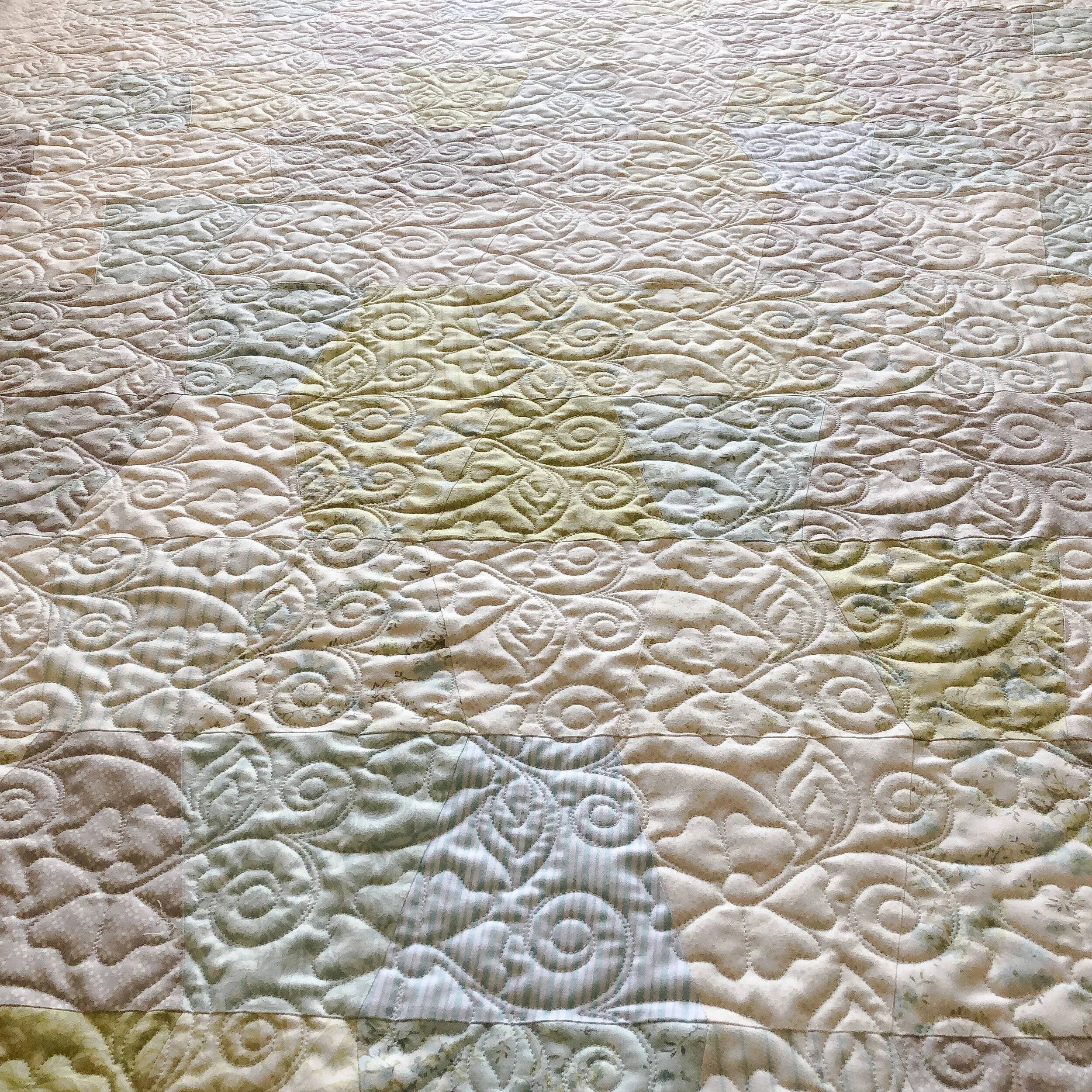 Look at that lovely texture. This is a prime example of looking at the overall design of the quilt blocks and fabrics, as you’re selecting the quilting design. I also want the scale to also be appropriate to both the fabrics and blocks. I think it turned out fabulous.
