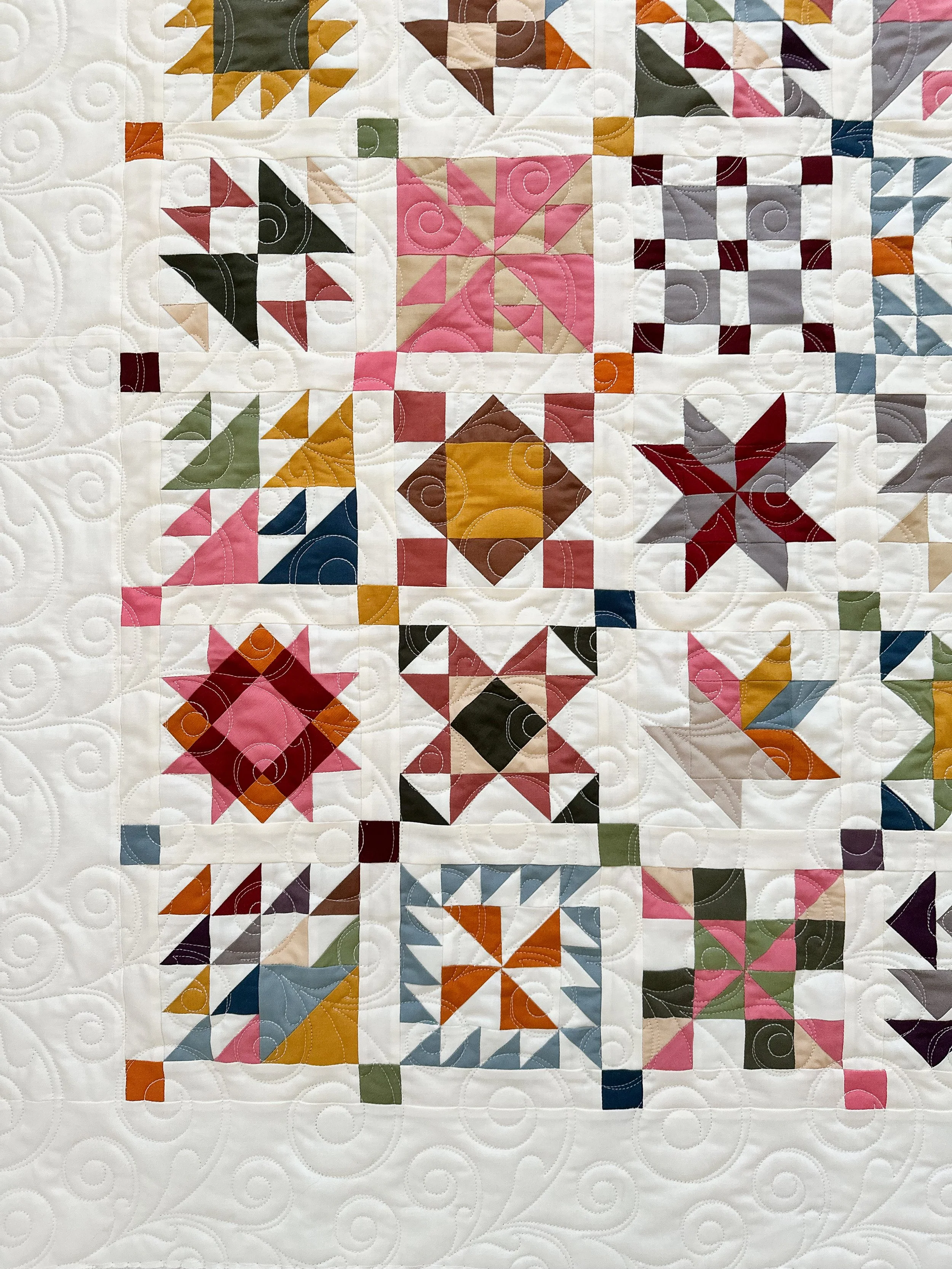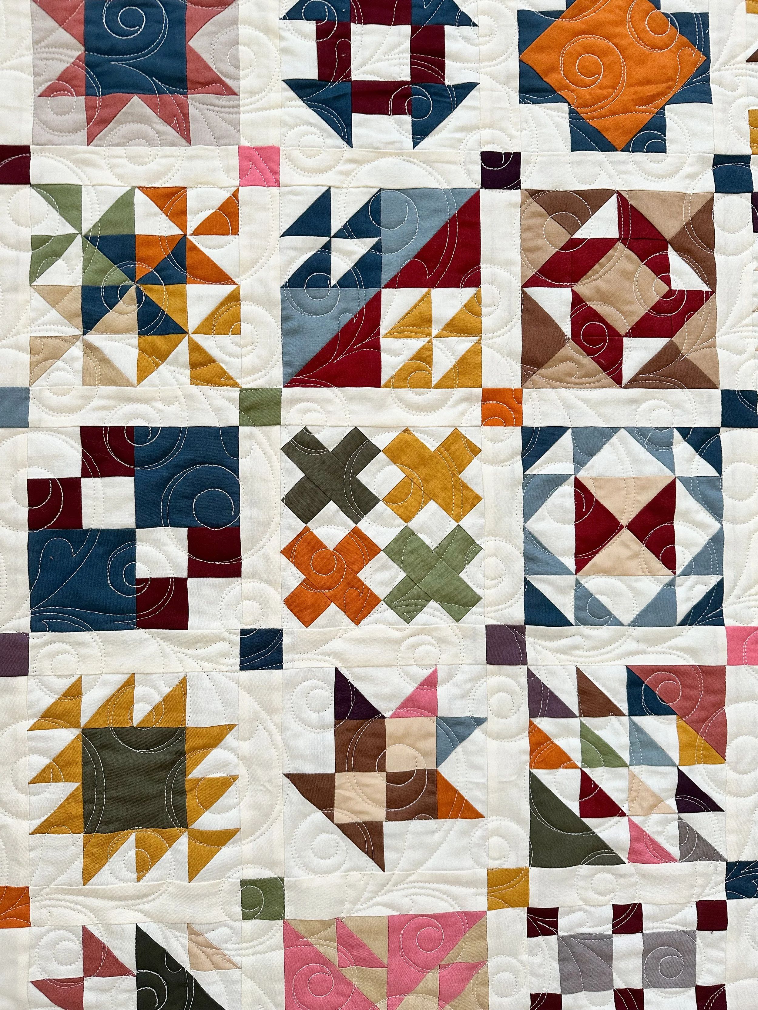 I think one of the many things that I love about this quilt are the solid fabrics. The colors pop against the off white fabric.
