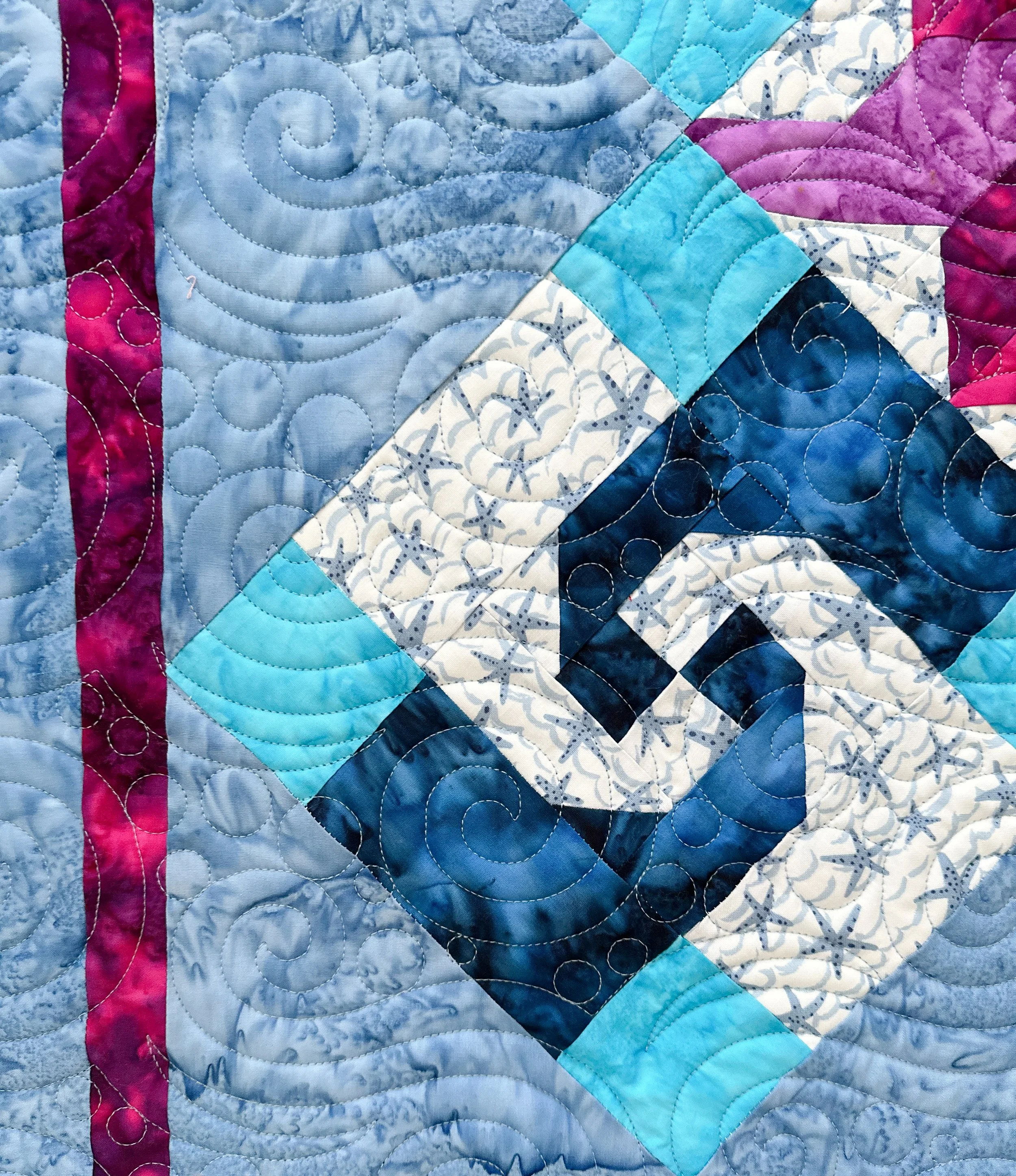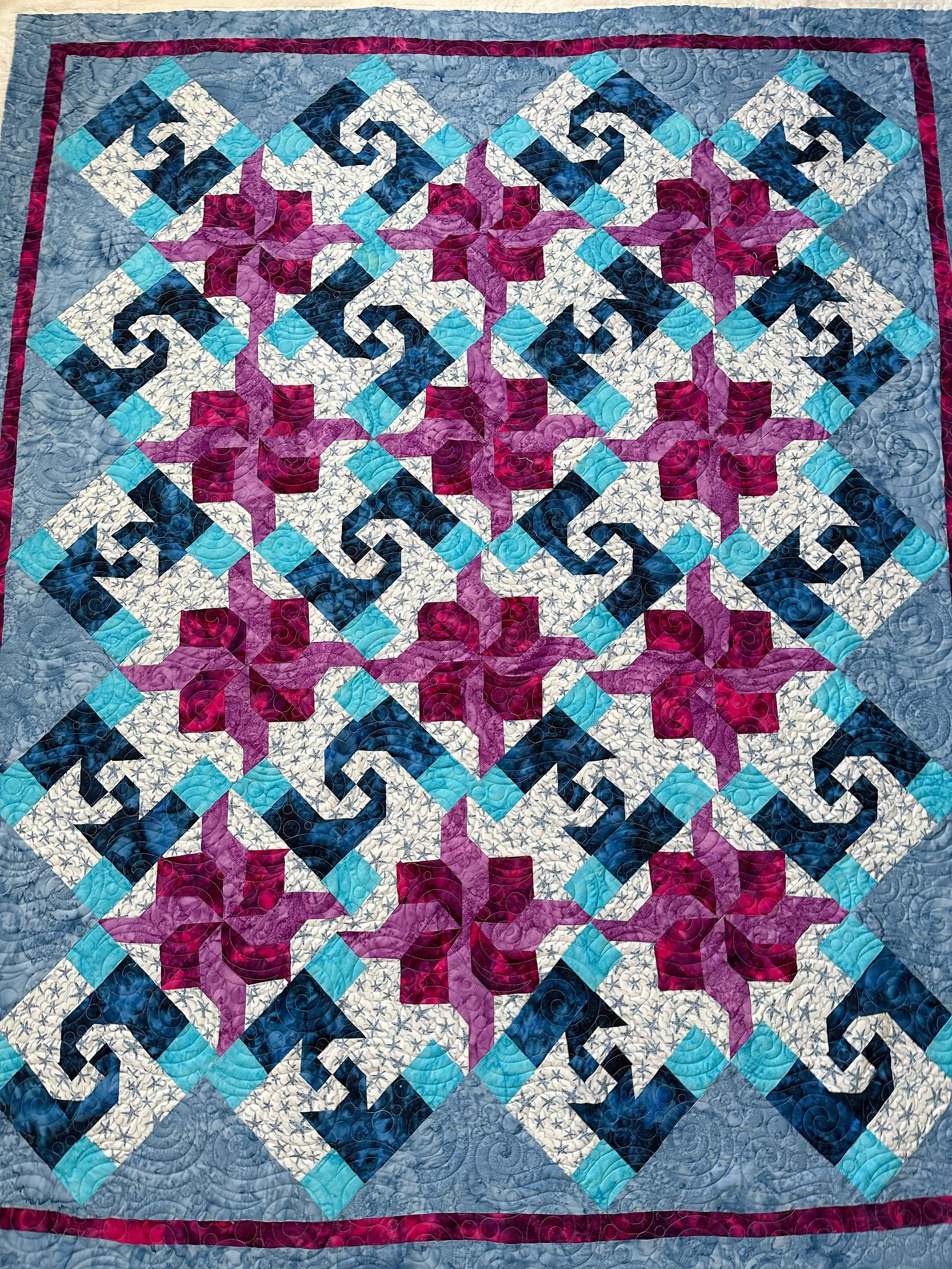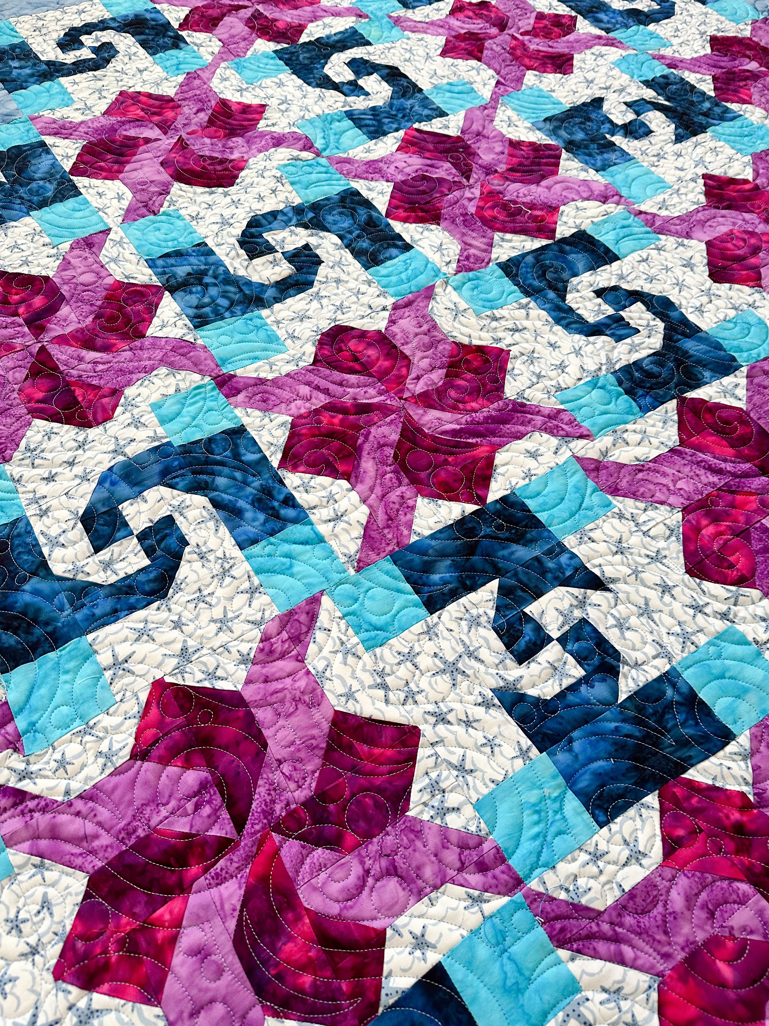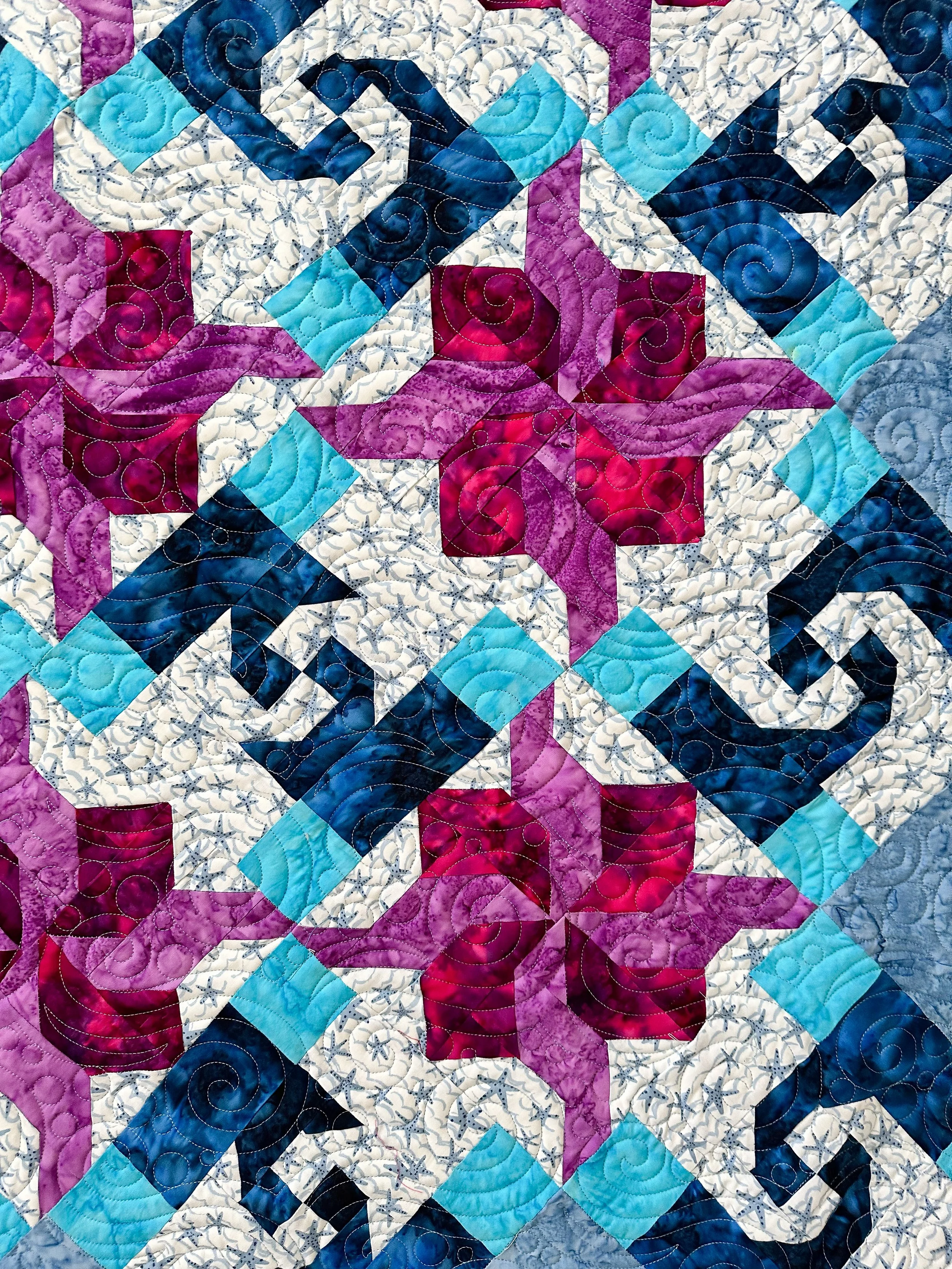 Kris is a new client of mine, and she’s sent me some amazing quilts to quilt, like this one. The pattern is called Ocean Currents by Pinetree Country Quilts, which can be found here: https://pinetreecountryquilts.com/shop/patterns/current/ocean-currents-quilt-pattern/