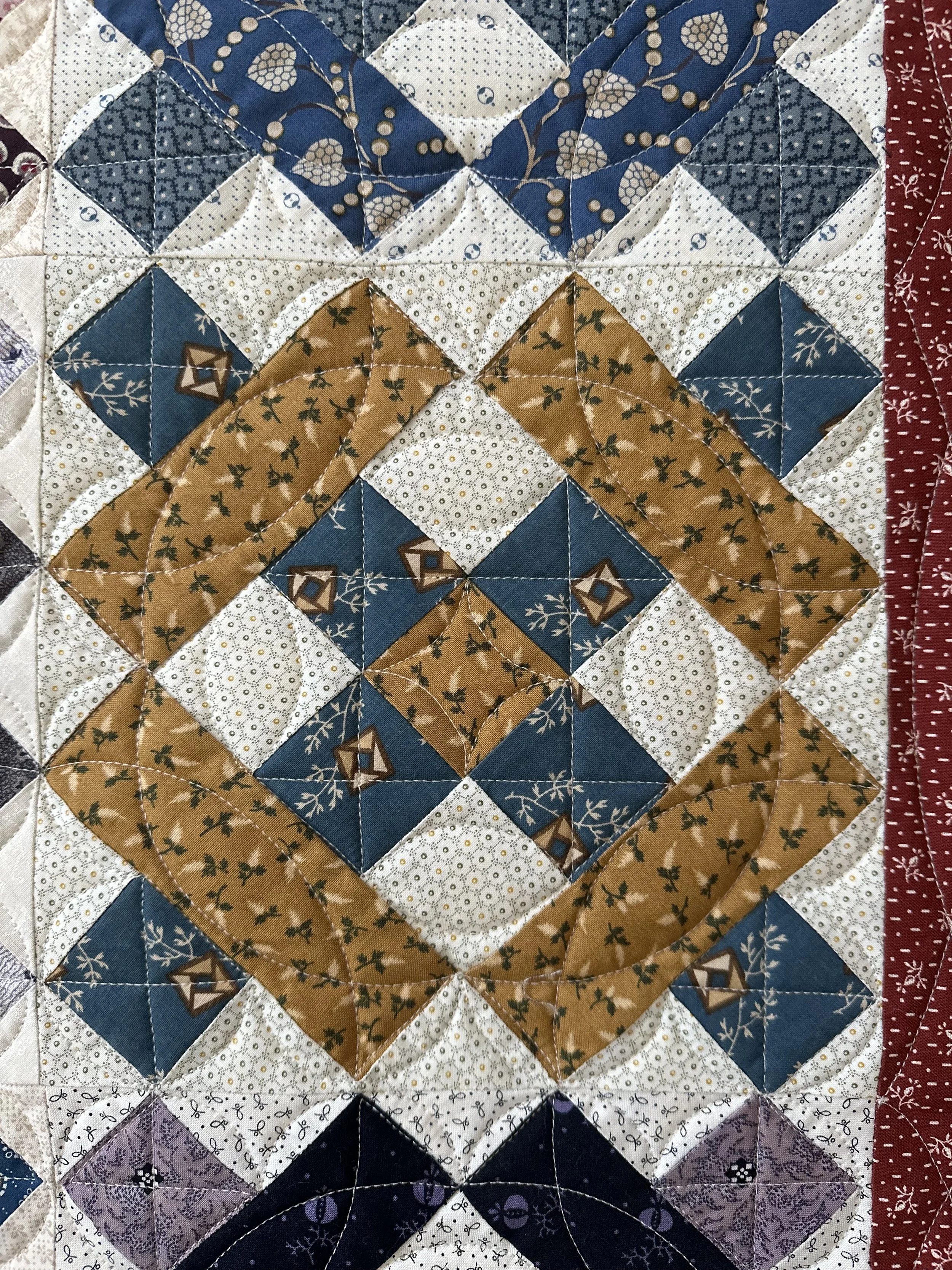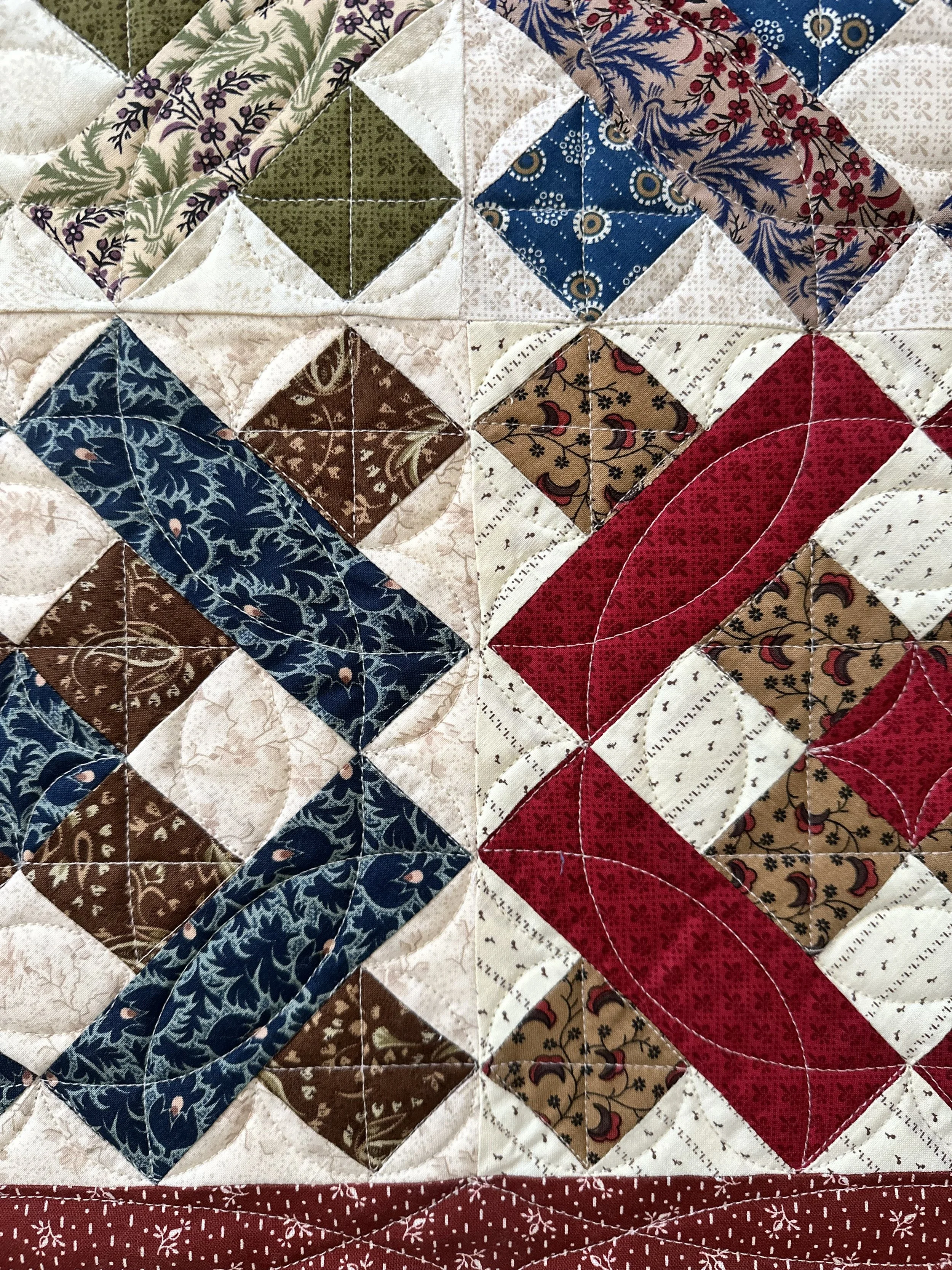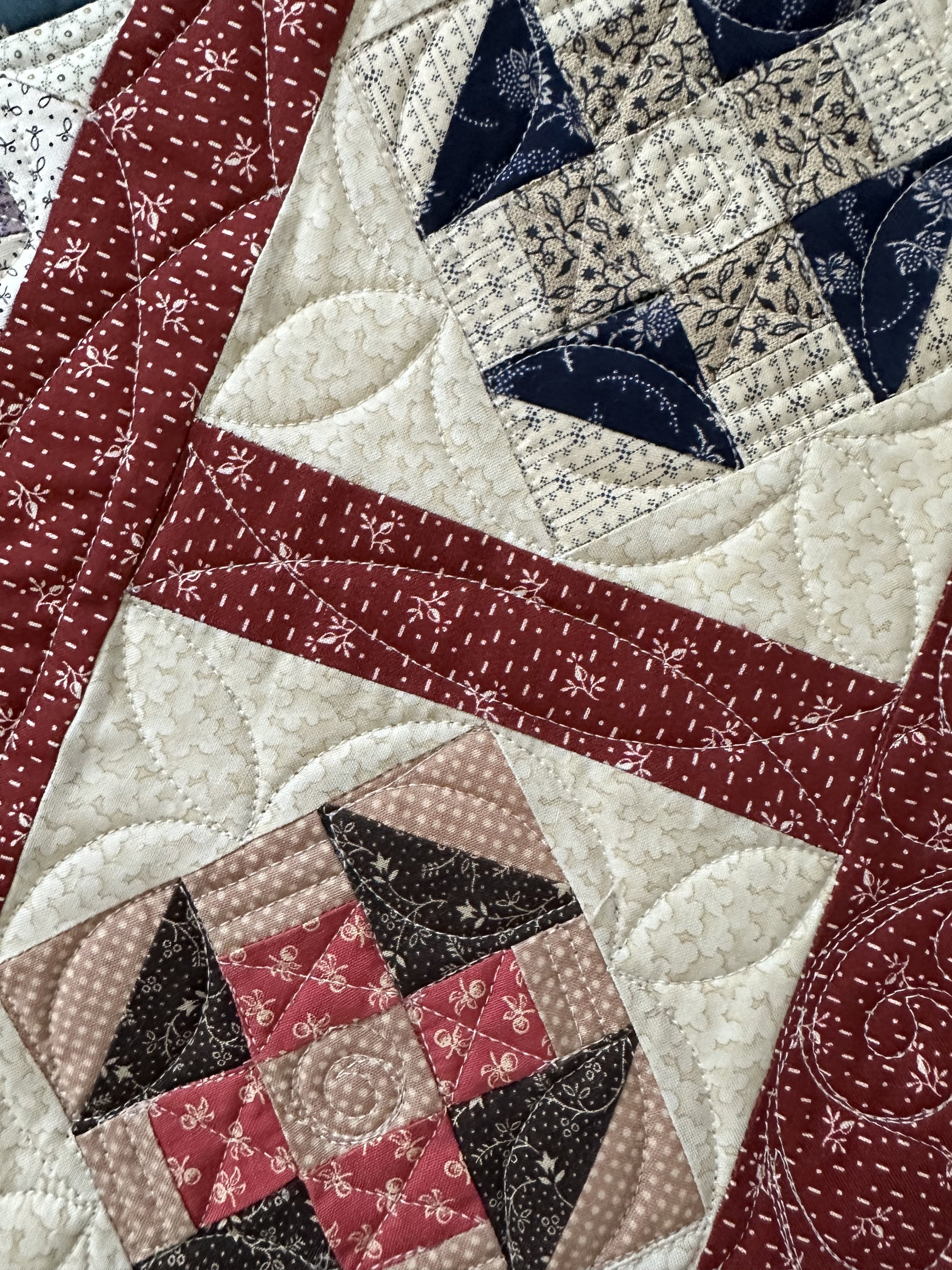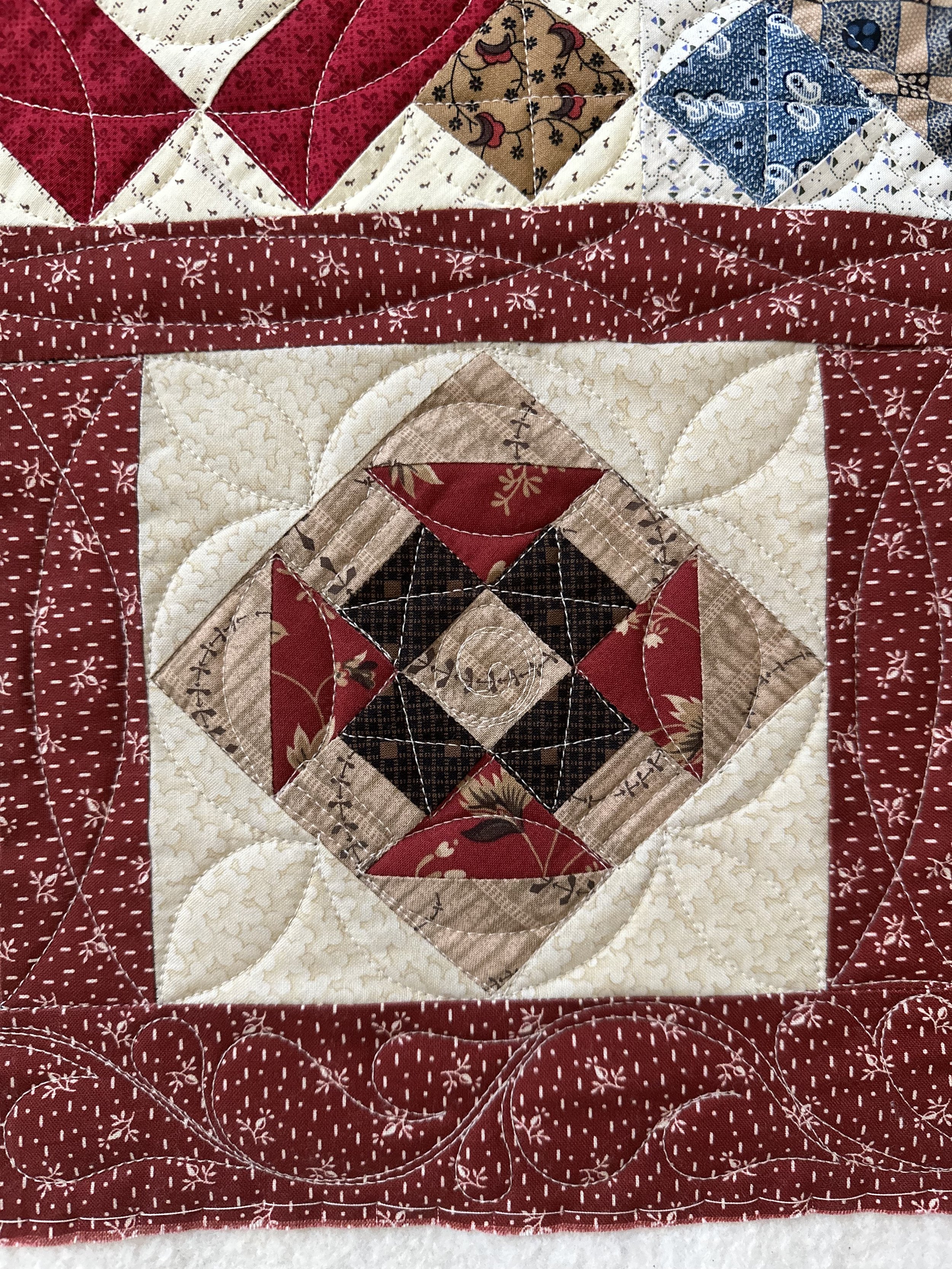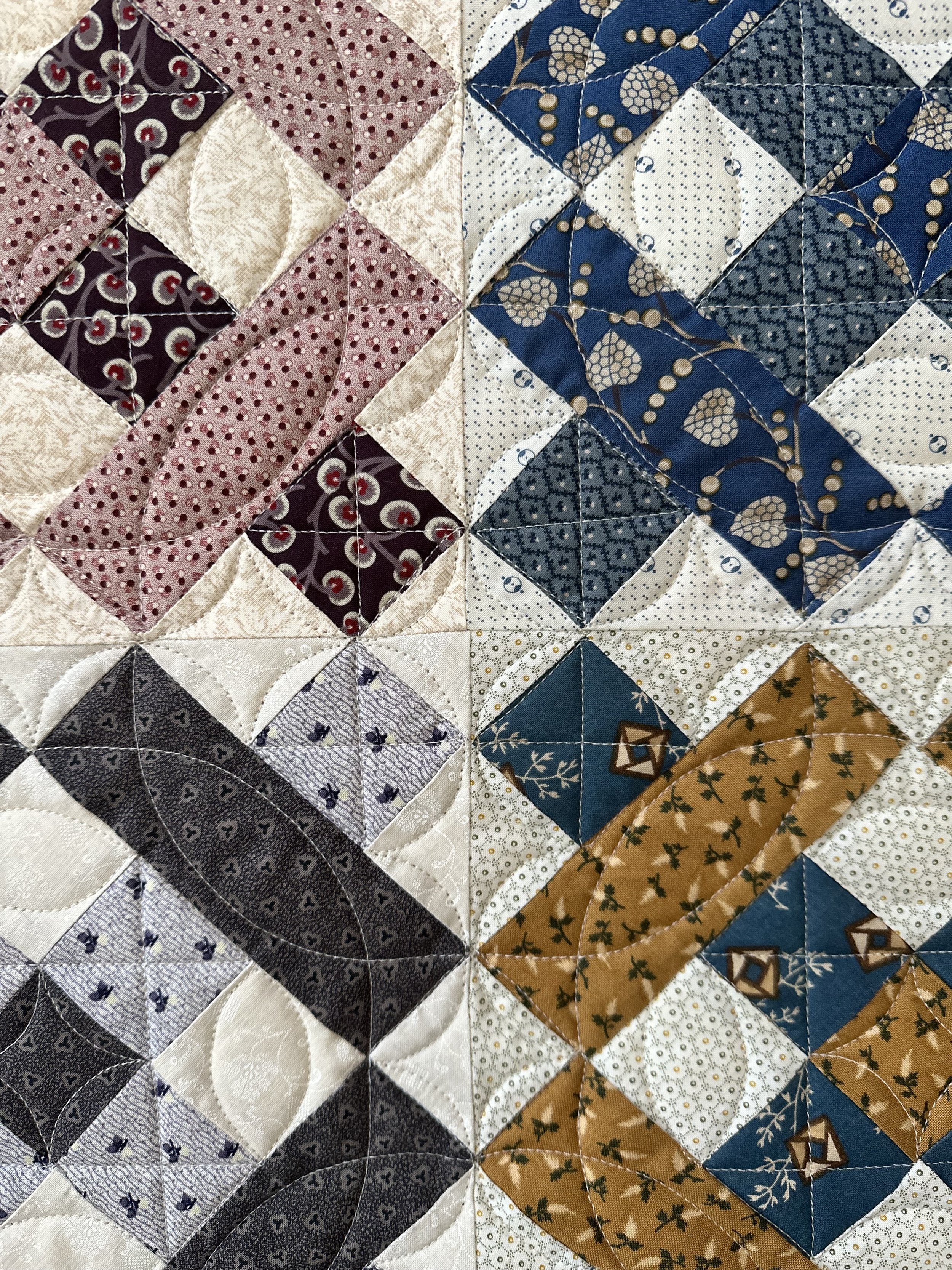 I used my 9” Circle2 ruler to quilt the curves for shorter sashing between the blocks. It’s my favorite design to quilt in sashing.
