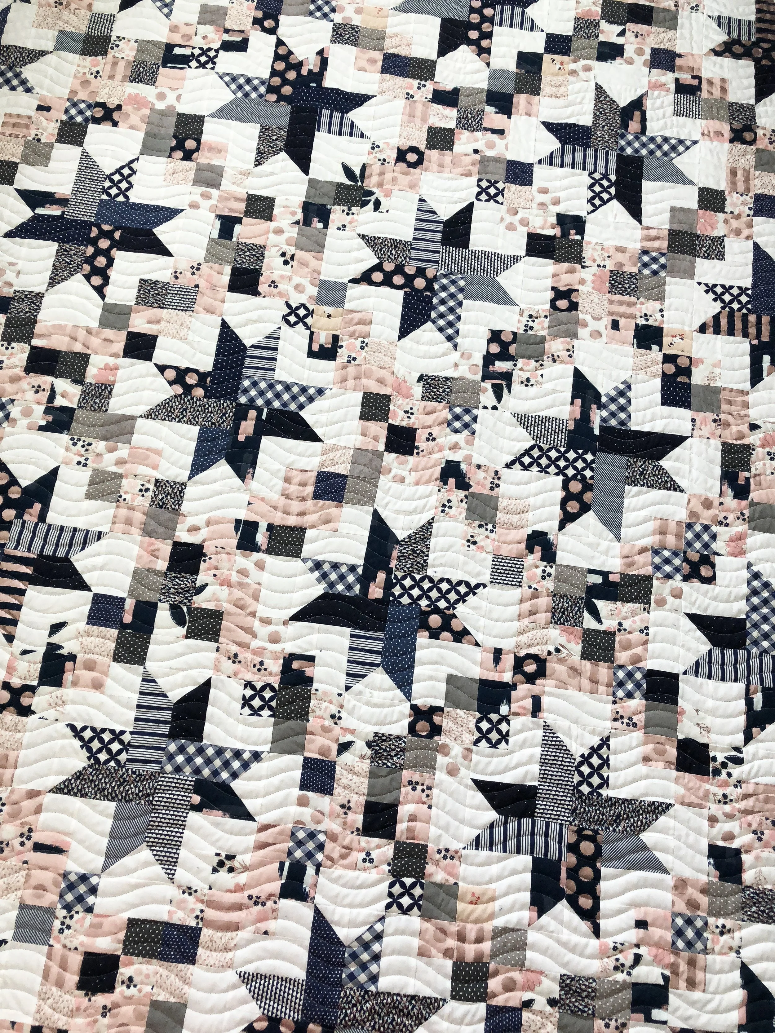 Beth made this stunning Patchwork Sky quilt for her son and soon to be daughter in-law. I absolutely love the navy’s and pinks, with a touch of rose gold metallics in the fabrics. The pattern is Patchwork Sky by Camille from Thimble Blossoms... here is the link to this pattern: http://thimbleblossoms.bigcartel.com/product/patchwork-sky-pdf-pattern