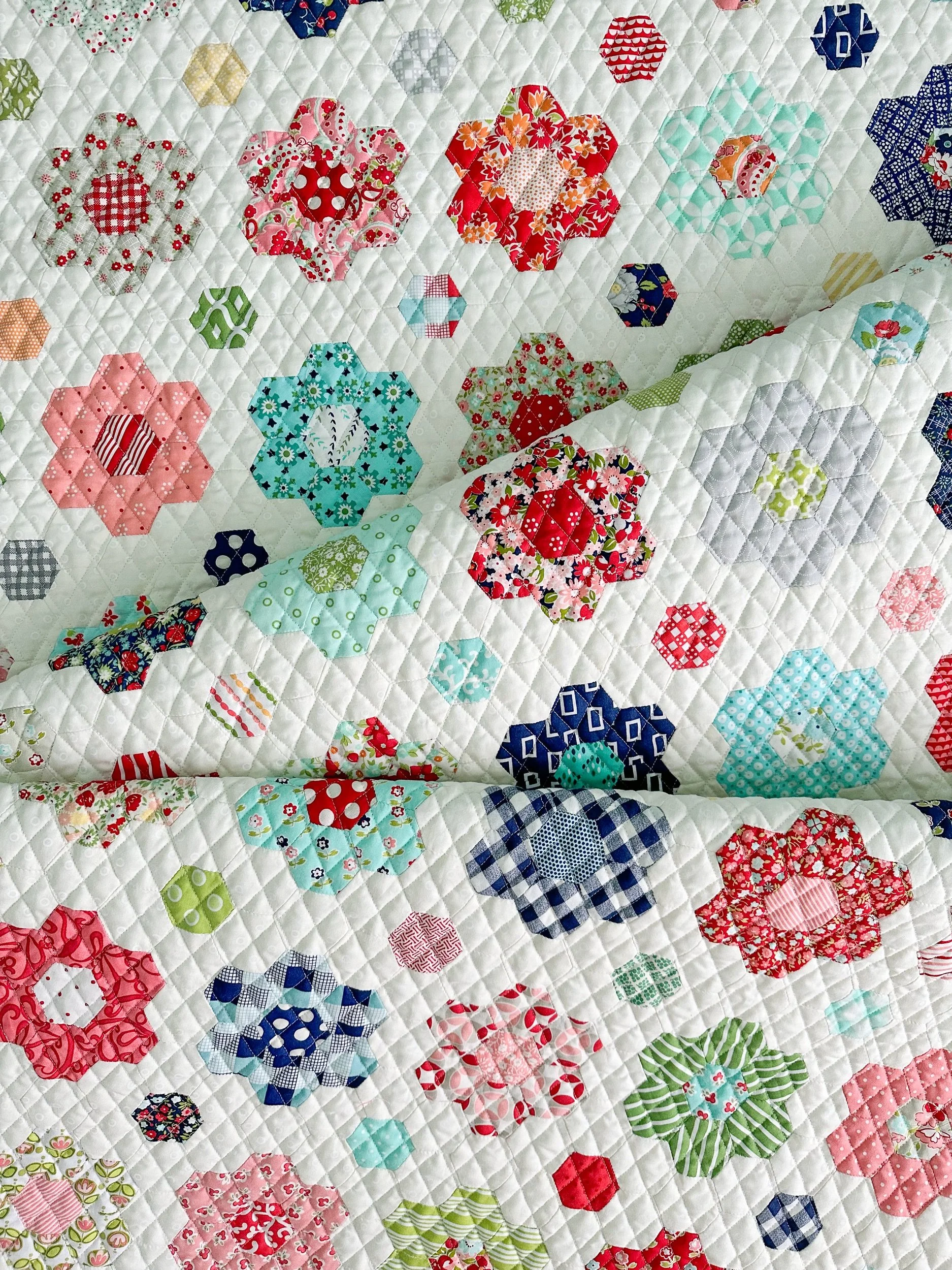 I have a few different Bonnie and Camille fabrics that I could have used for the binding, but this on point gingham print from their Vintage Picnic line was the perfect choice. It’s great with the quilting, but I wanted a lighter binding without a bold print. I feel like a red or navy would have distracted from the overall look of the hexie flowers.