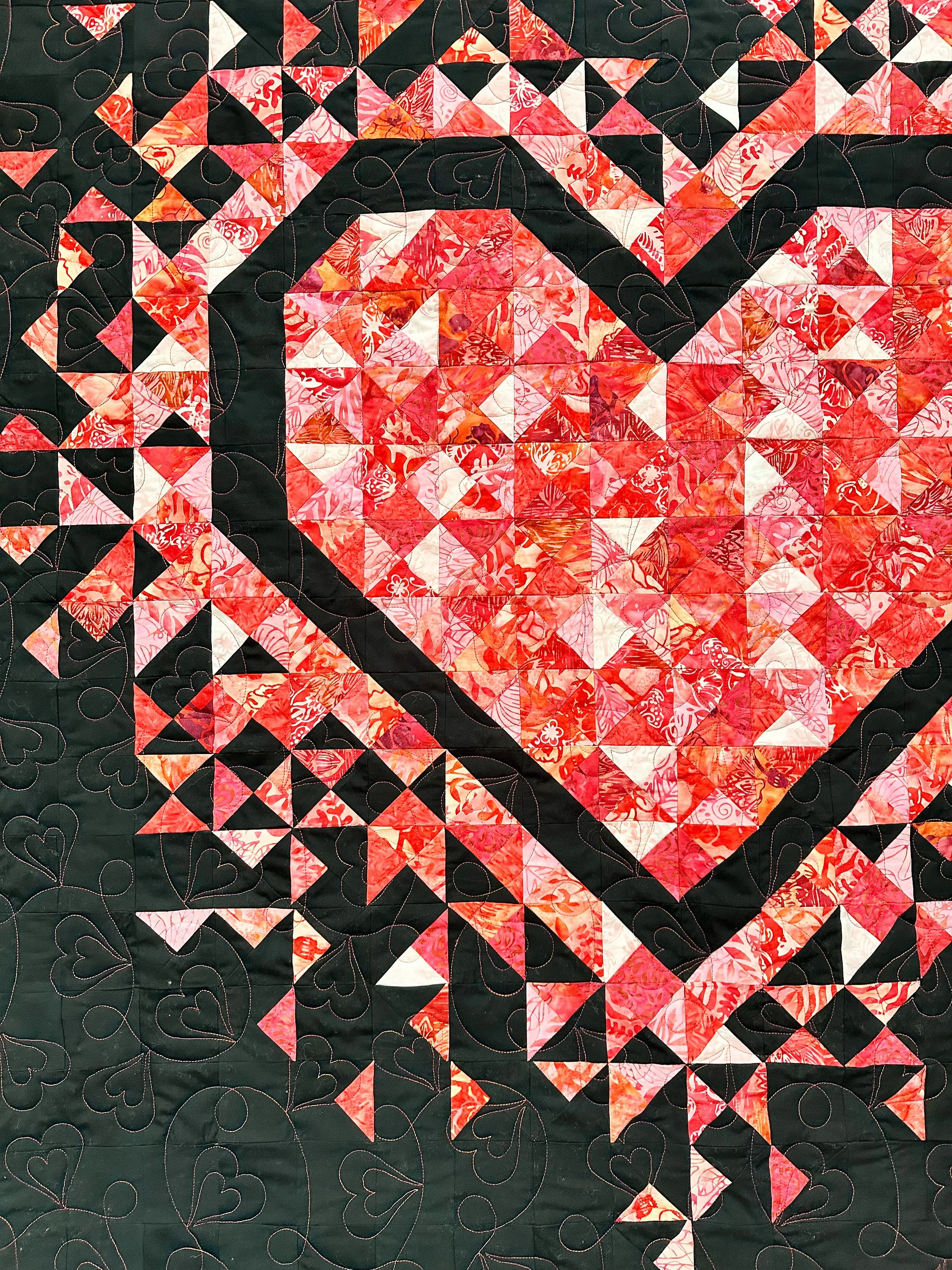 I quilted my freehand Overlapping Circles behind the hearts, which is one of the designs that I teach in my Quilting It Freemotion course. Go to: https://www.quiltingit.com/quilting-it-freemotion-course to learn all about it. If you’re interested in learning to quilt freemotion, join me!!!