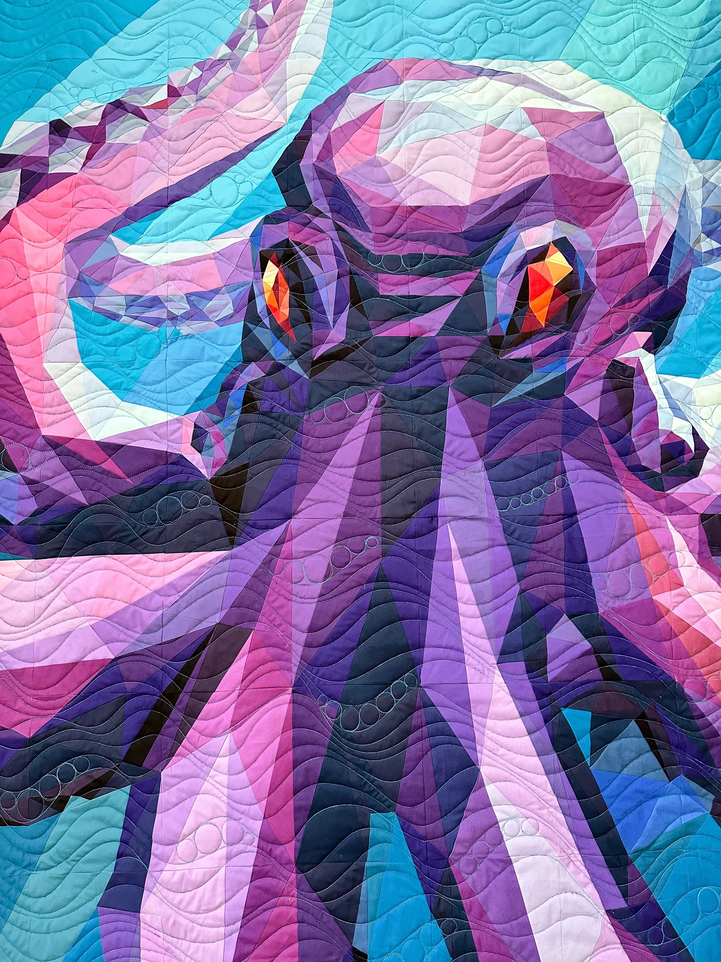 Denise wanted an organic wavy line and I asked if it would be okay to add random circles throughout. When I think of octopuses I think of bubbles. I love how it turned out. I quilted everything freehand. I quilted the wavy lines first and then quilted the circles in here and there between the gaps in the curves.