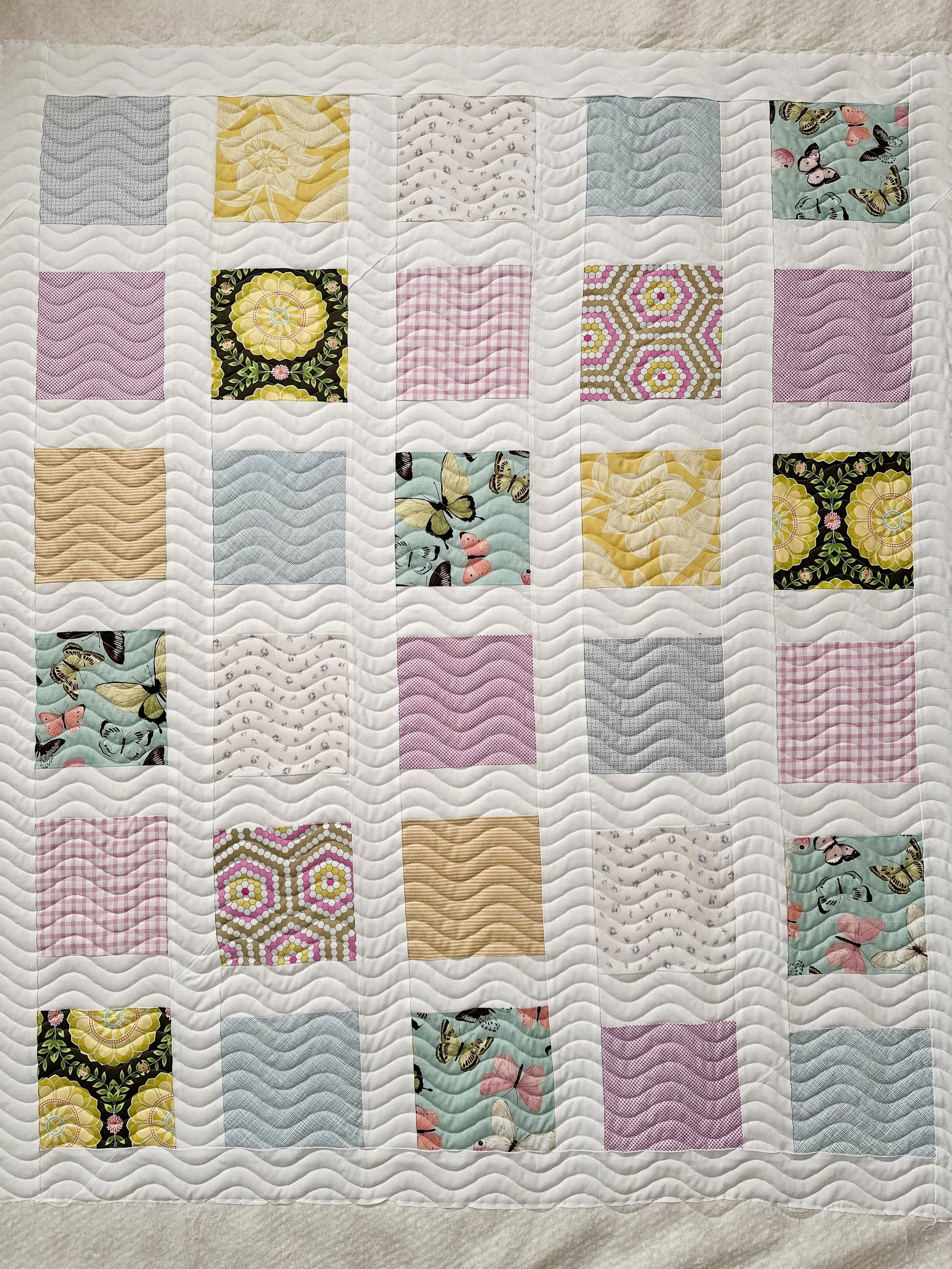 My mom and I love to make baby quilts for family when they have their first baby, and we’ve learned that some people prefer a simple patchwork quilt over the ones with blocks or a pattern. I love patchwork quilts!! I made one last year for myself. Never underestimate the simple look of big squares. These squares are around 8”, if I remember right.